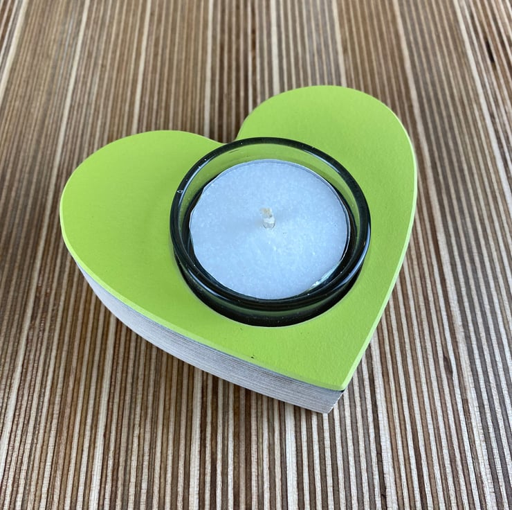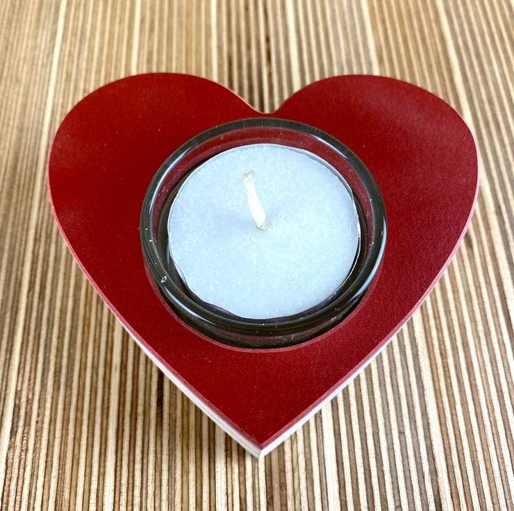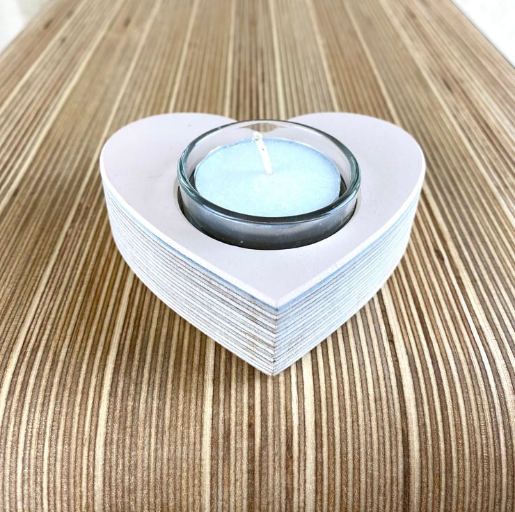 Introducing our heart-shaped glass and birch ply tea light.