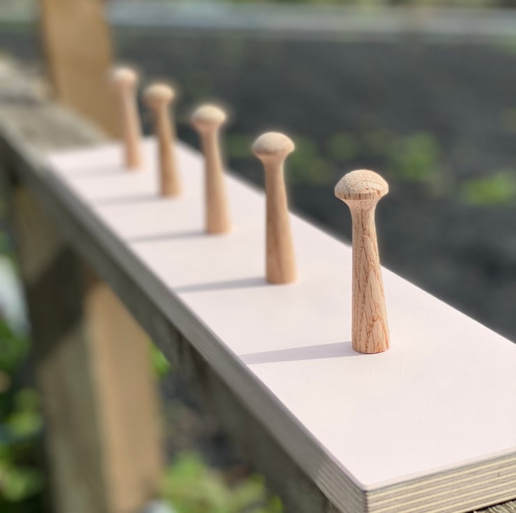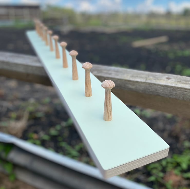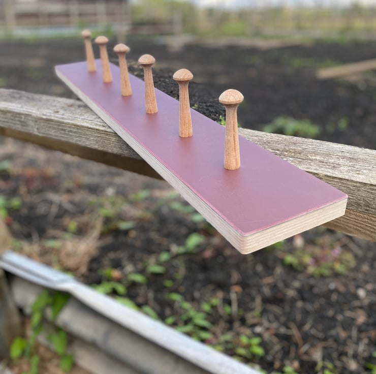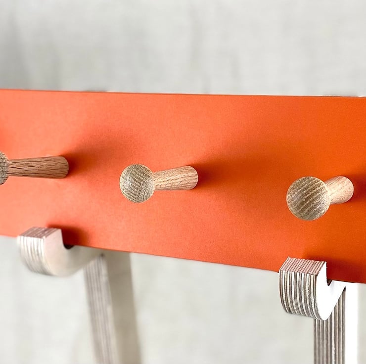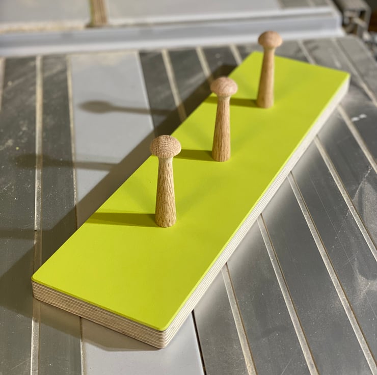 The shaker pegs are set in birch ply and the surface is finished in our vibrant linoleum. The linoleum comes in lots of different and modern striking colours.