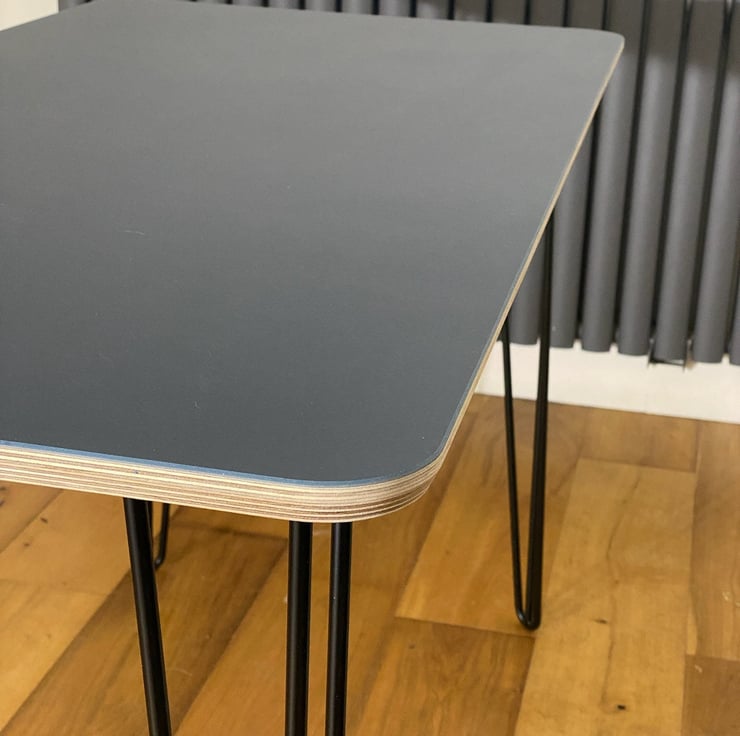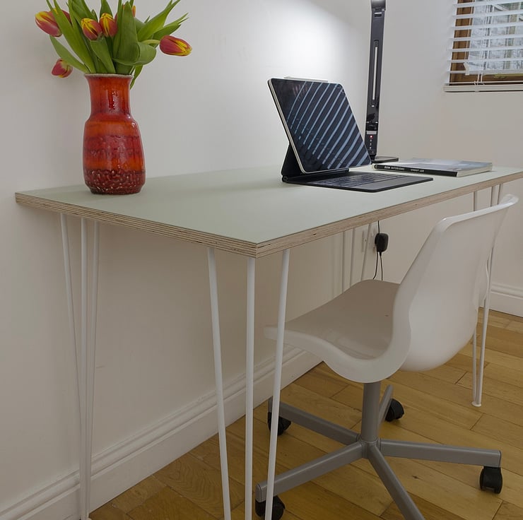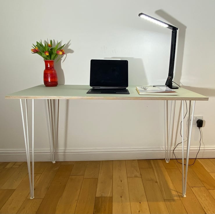 A simple and contemporary birch ply table 1200mm x 600mm which is finished with coloured furniture linoleum and strong, steel hairpin legs. There is a wide choice of different linoleum colours and hairpin legs available. Perfect for your home office, choose your colour to create a bespoke, fresh and modern work space.