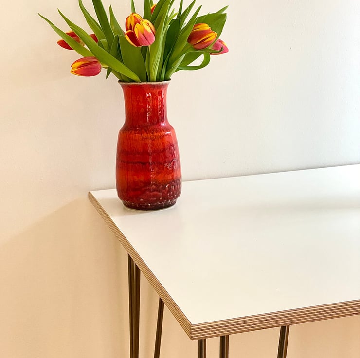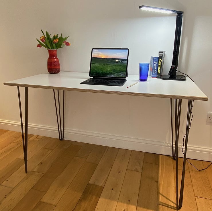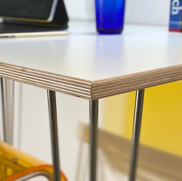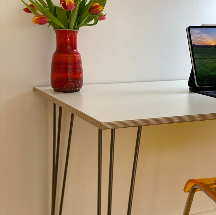 A fresh, white laminate birch ply desk, 1200mm x 600mm and 18mm thick, with strong, steel hairpin legs. This understated and modern desk is easy to keep clean, with a wipeable surface. The birch ply is finished with high quality Osmo raw oil to keep it protected, while still retaining the attractive pale, natural look of the birch ply layers. This desk provides the ultimate for your minimalist and modern look.