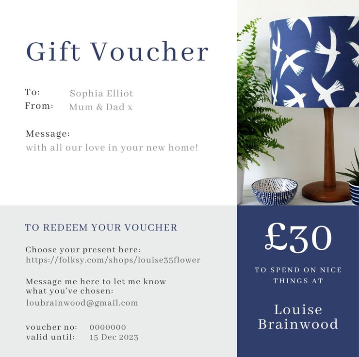 Vouchers are redeemable for items in my Louise Brainwood shop and their associated package and posting costs.