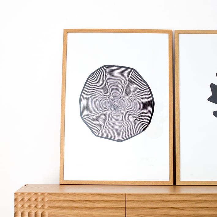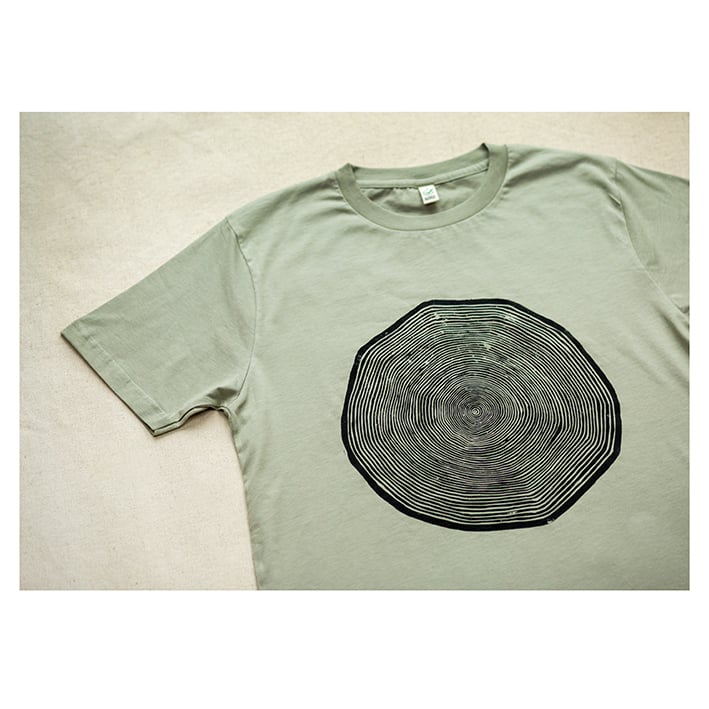 This t-shirt started life as a scribbled 70th birthday card for my Dad - I thought it would make a brilliant print so made a few lino cuts with 40 then 50 "rings"... a friend saw one framed and suggested it would make a great t-shirt which I agreed! I then sourced a local place that used lovely quality t-shirts and would screen-print small batches by hand. It's still one of my favourite designs, which is why I keep adding more colours!