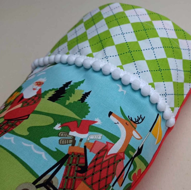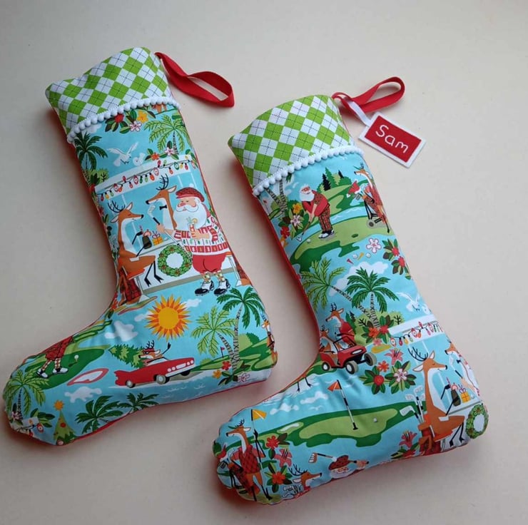 The front of the stocking features the great "a hole in one" print from Alexander Henry and a complementary argyle diamond print, and is trimmed with a white pompom trim. It is backed in red cotton and lined in green, and has a strong hanging loop so it can be hung up for display before filling with gifts.