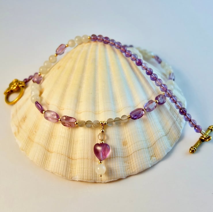 At the centre of this pretty necklace is a handmade pendant featuring a 5mm Rainbow Moonstone, 8mm Amethyst heart and 4mm faceted grey Moonstone coin bead, separated with 2mm gold vermeil spacers and set between six more Moonstone coins and six 7-9mm Amethyst ovals.