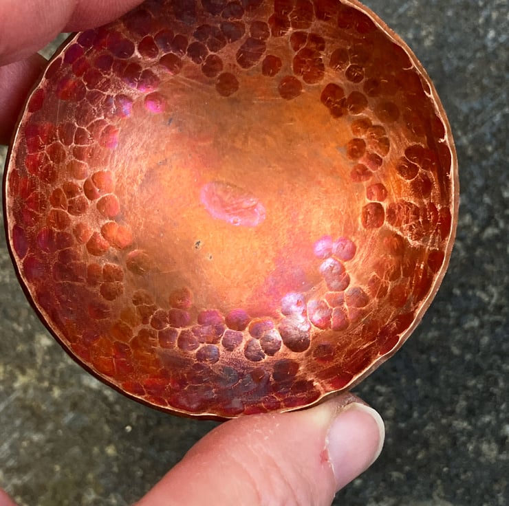 These tiny copper bowls are formed from flat sheet and finished with hammered texture.