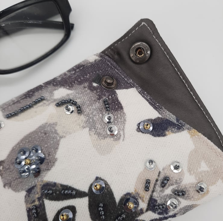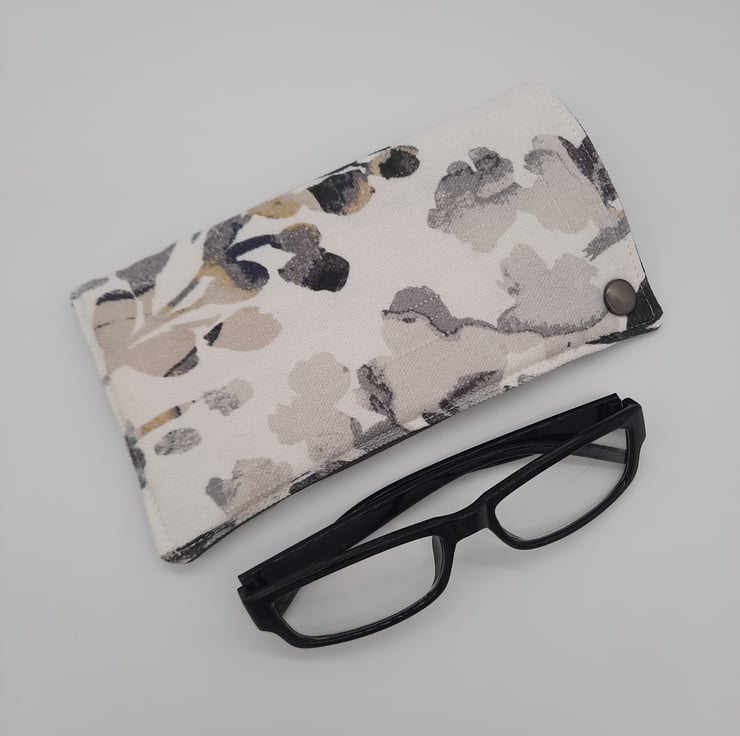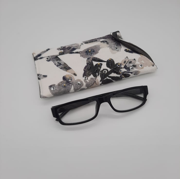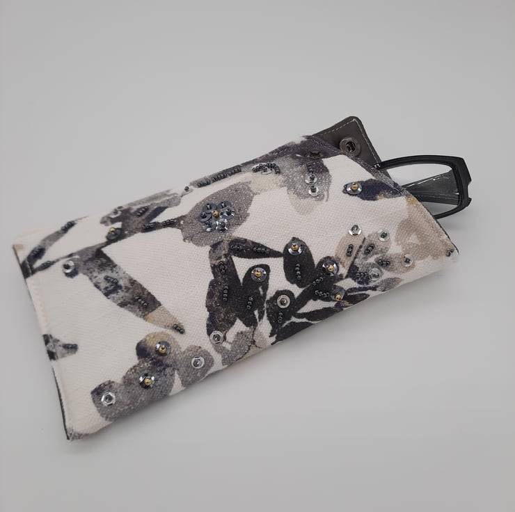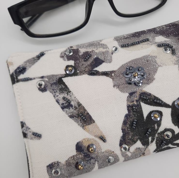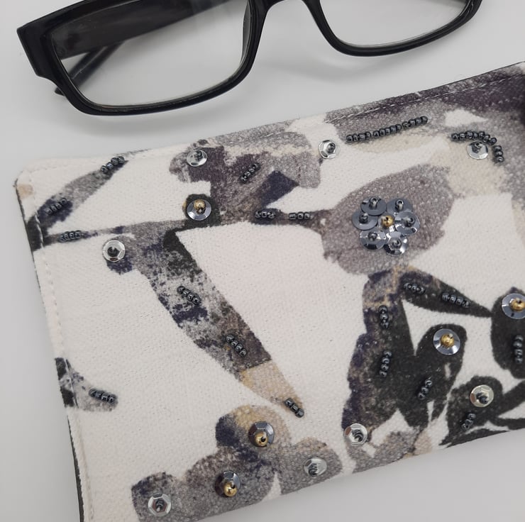 Glasses case made using a white fabric with black foliage print.