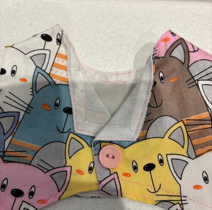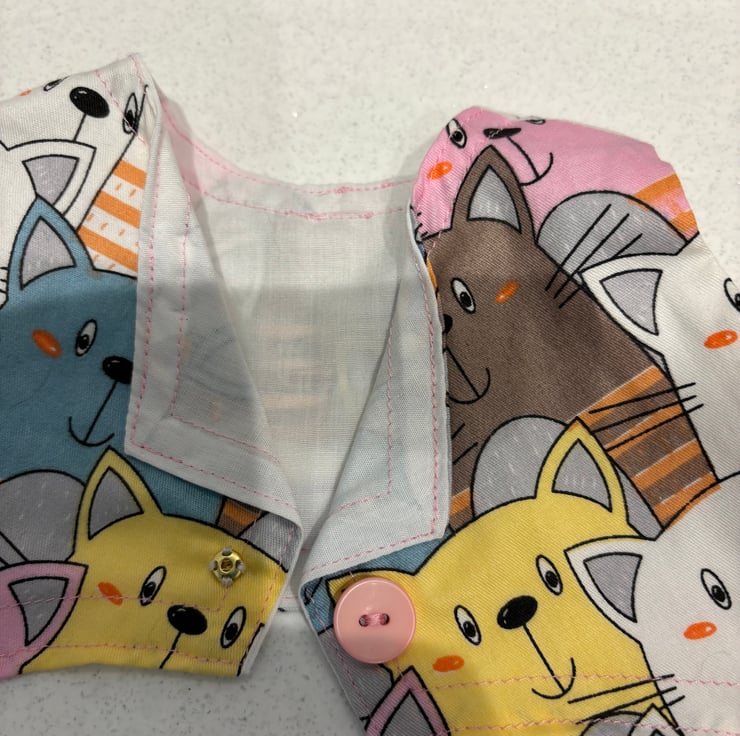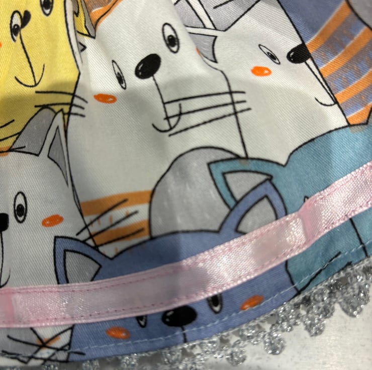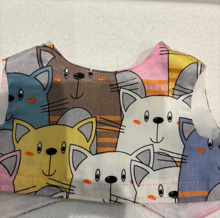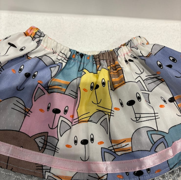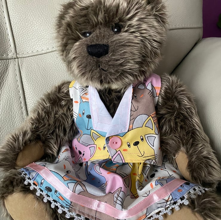 This is a really fun print, lots of cats. This is a large size teddy outfit. Skirt and waistcoat. Made to fit a bear approx 19”/38cm tall. The skirt is trimmed with pink ribbon and silver lace. The waistcoat is closed with a button and snap fastener. Suitable for children over 3 years. Small parts.
