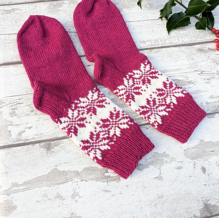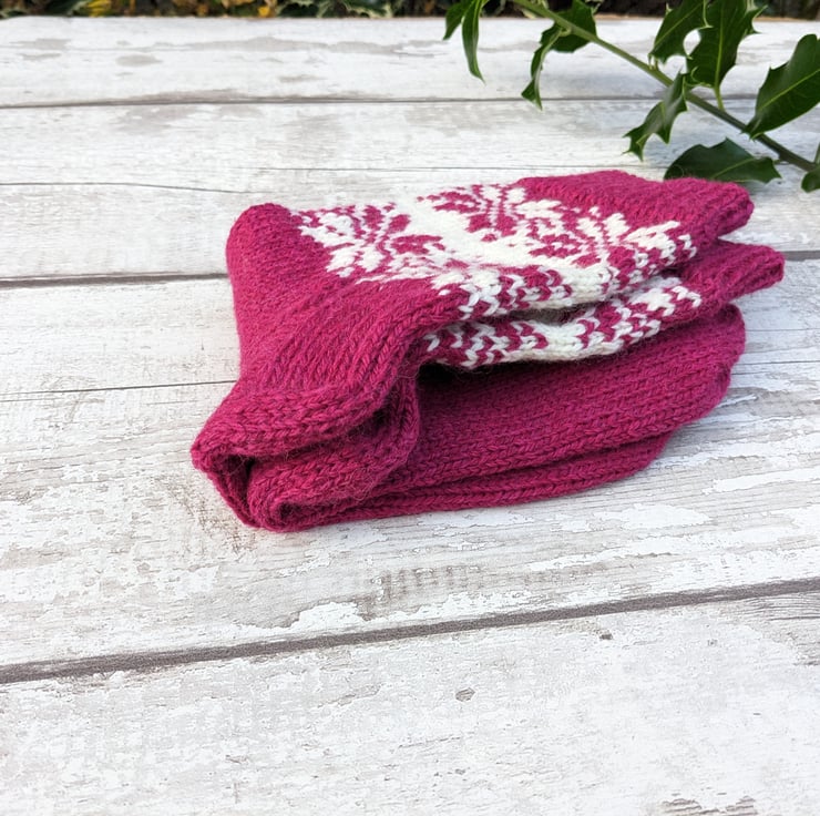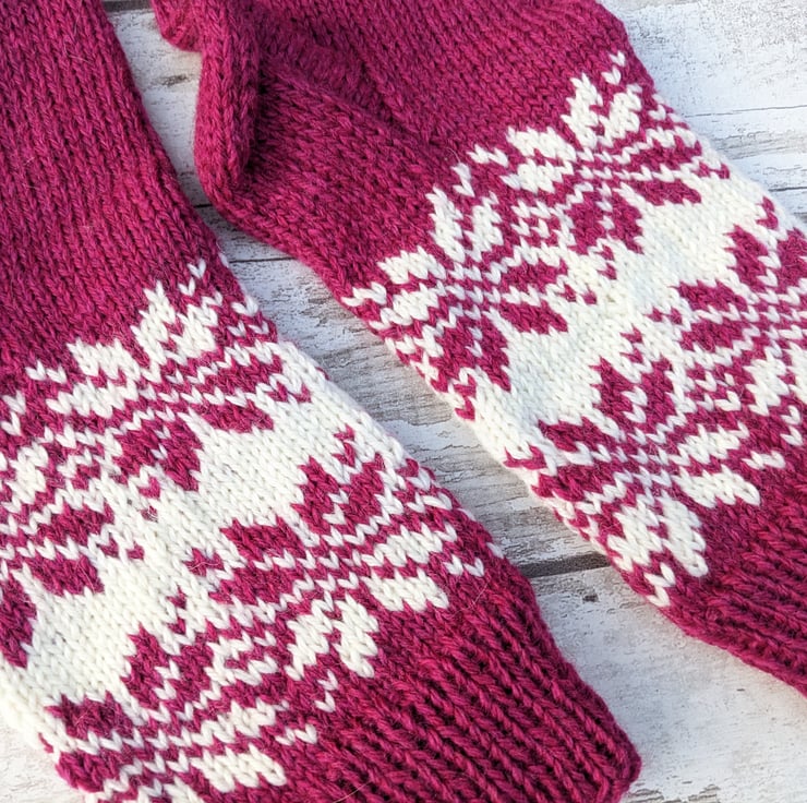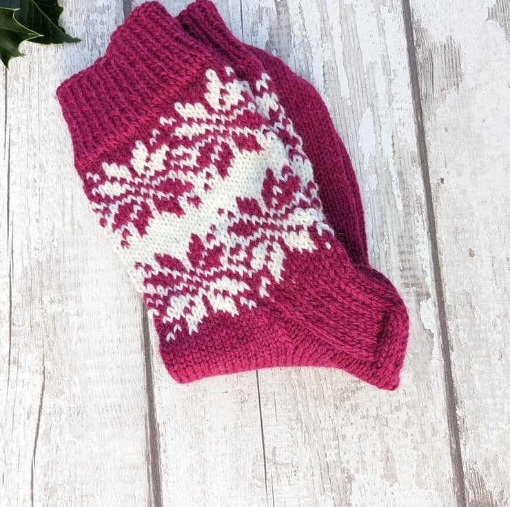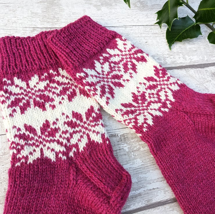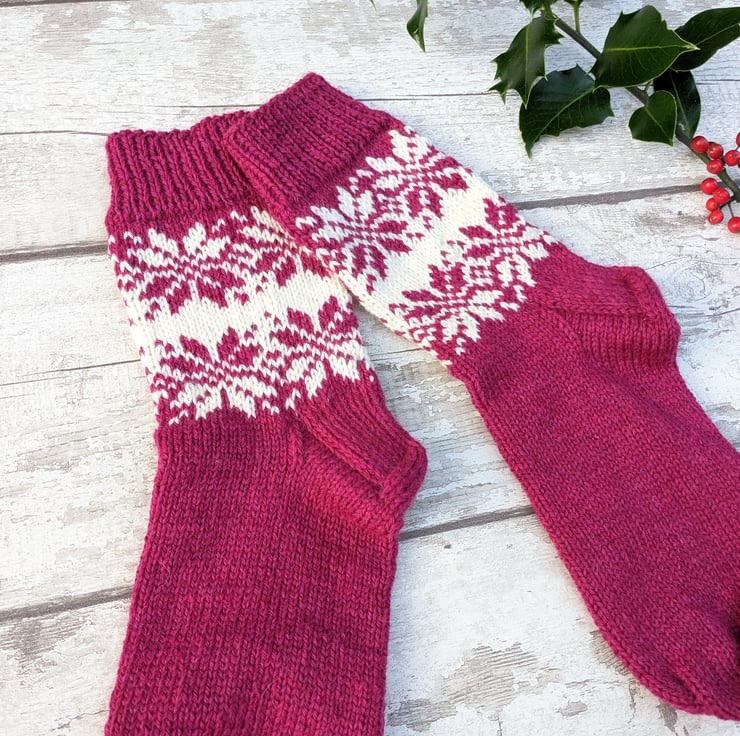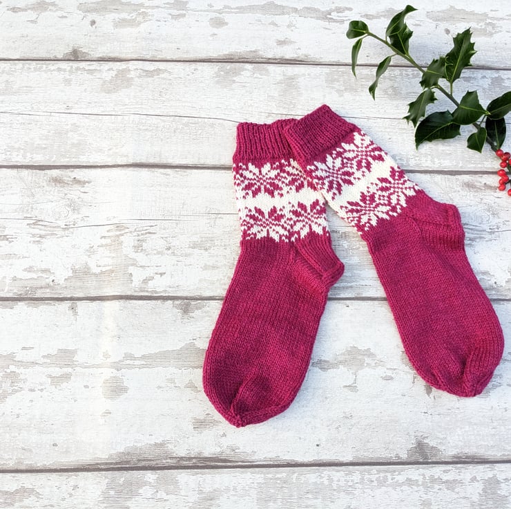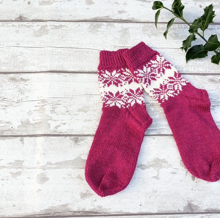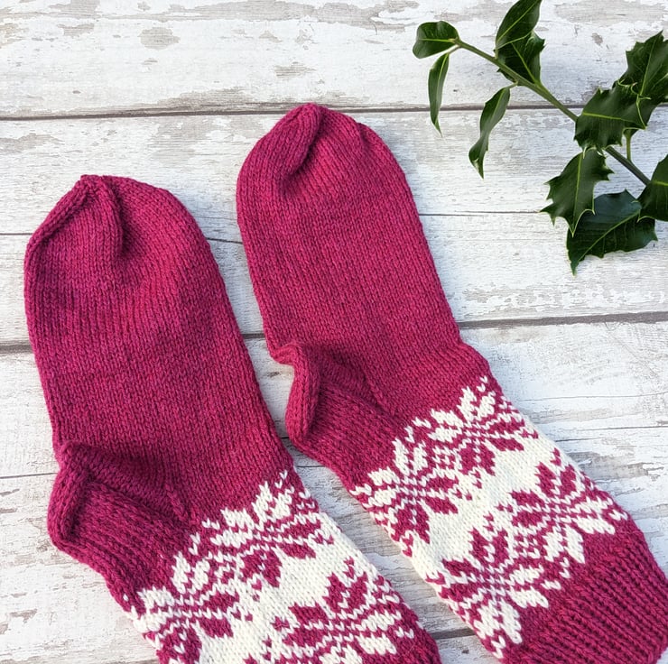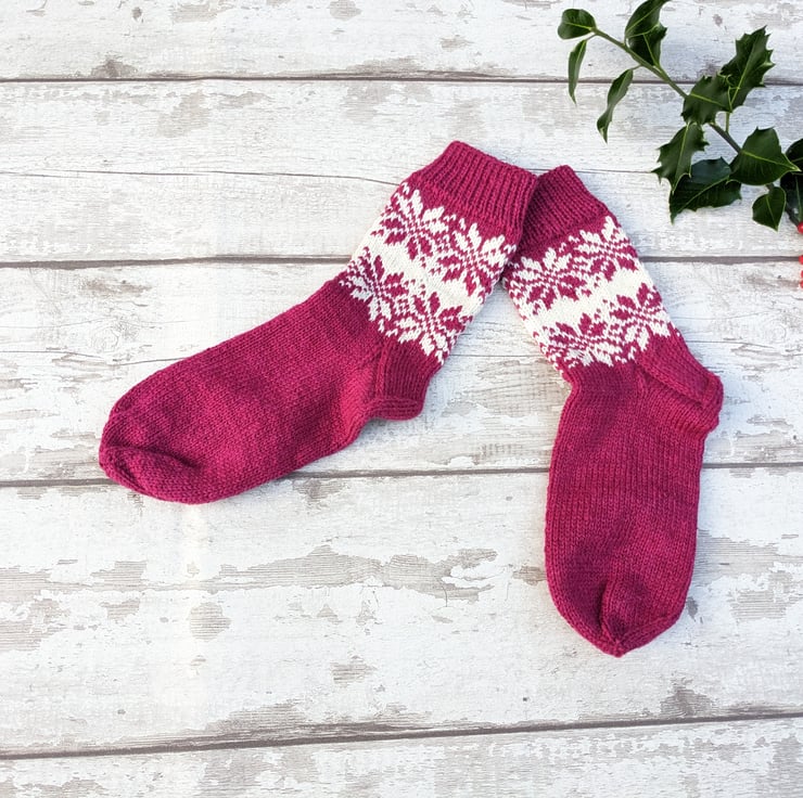 Handknit women's woolly thick socks in plum with fair isle pattern added for contrast and appeal.