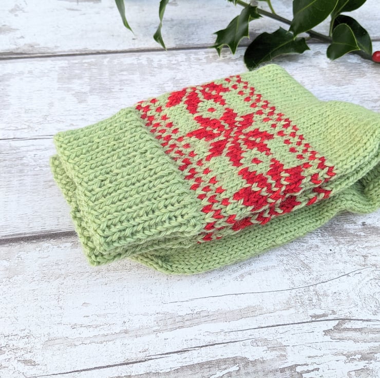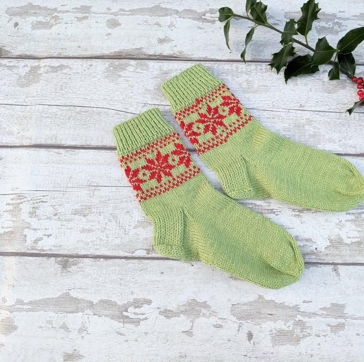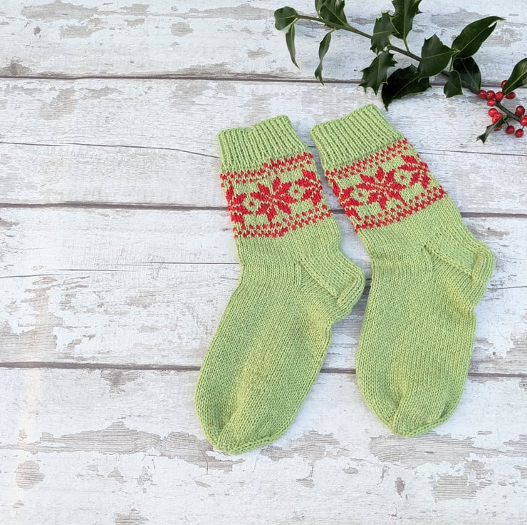 Handknit women's woolly thick socks in light green with red fair isle pattern added for contrast and appeal.