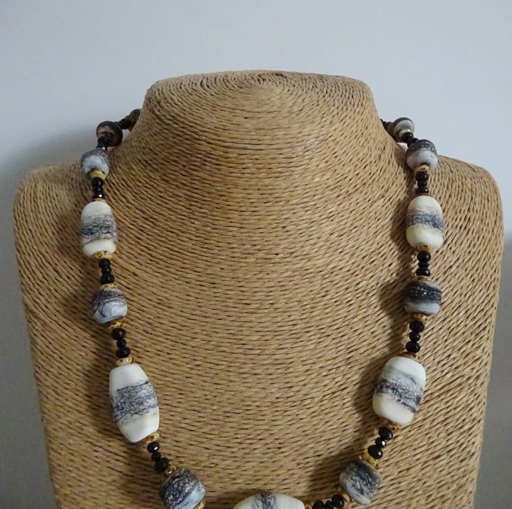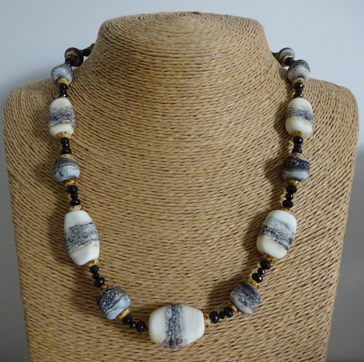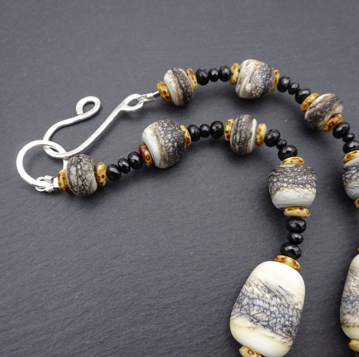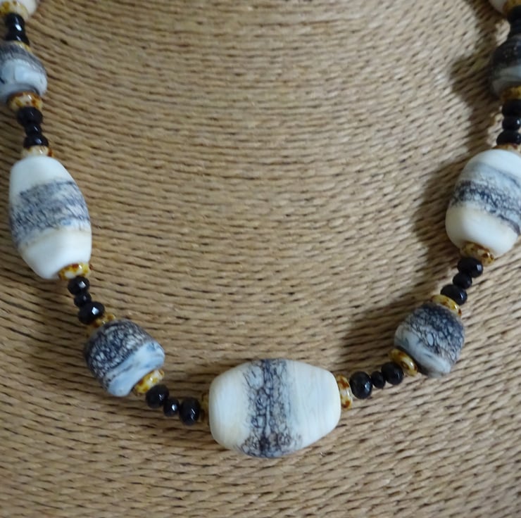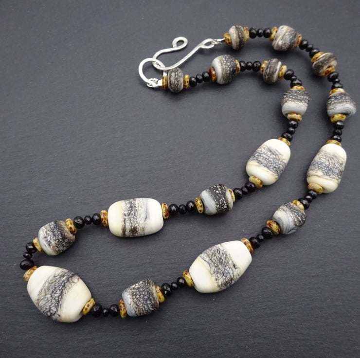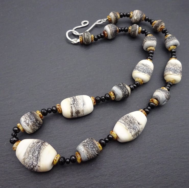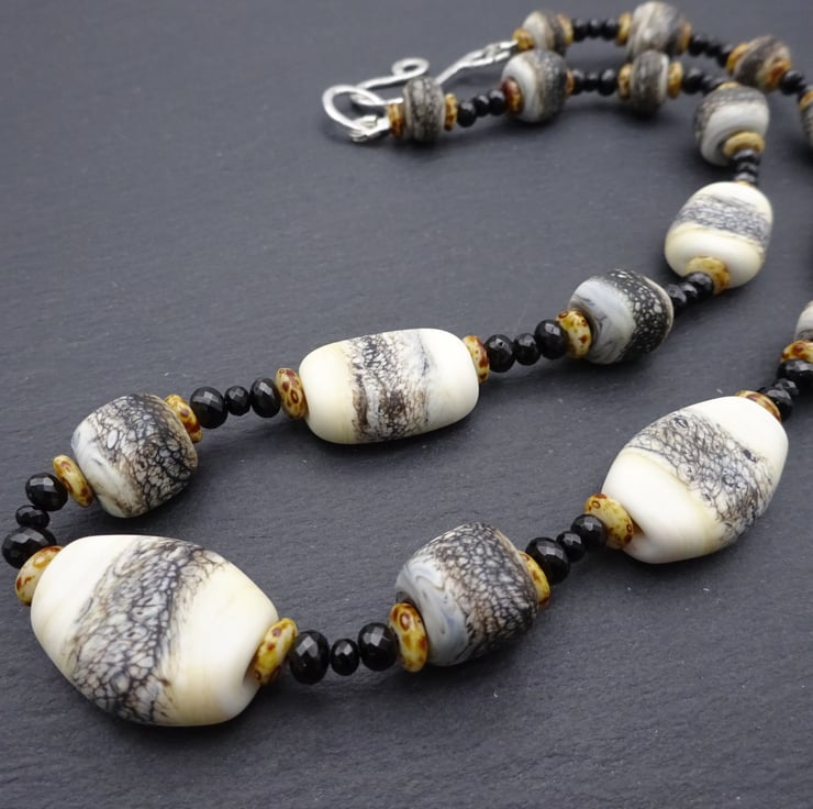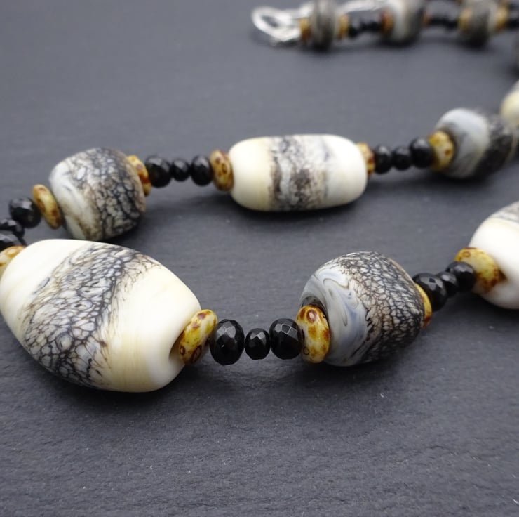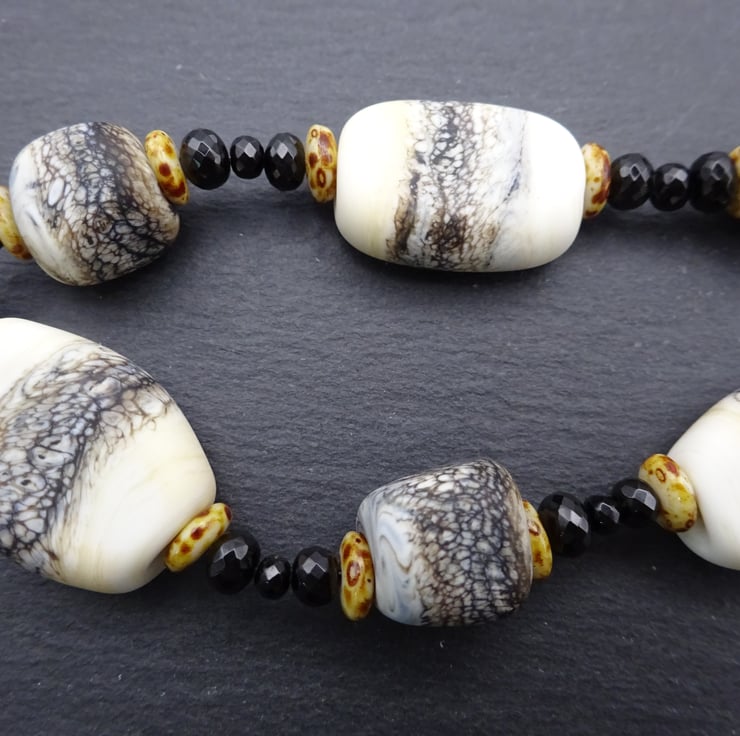 The lampwork beads have been handmade by me using ivory and black mottled glass, they have been tumbled to give a smooth finish.
