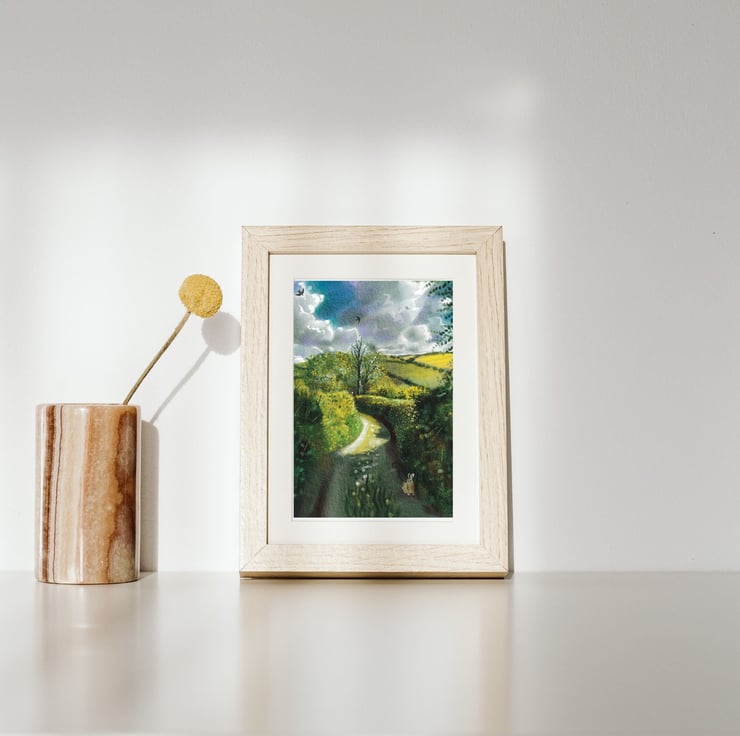 This print is from a digital painting of the view from the top of the country lane near where I live in East Cornwall. It depicts a typical view of the English countryside in spring time.
