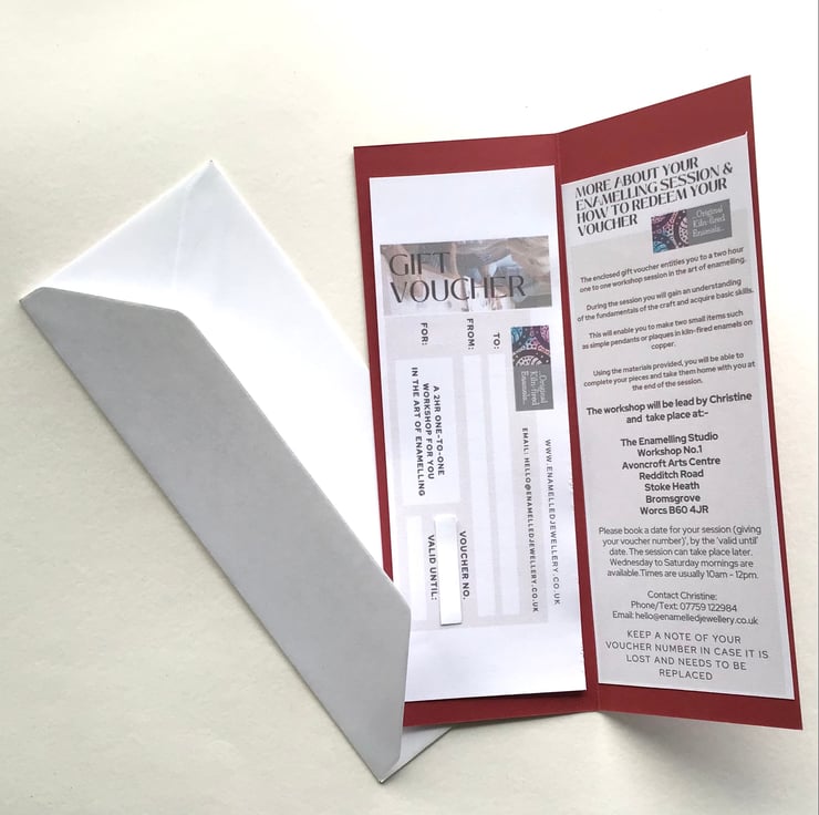 This voucher entitles the recipient to a two hour workshop in which they will learn the basic skills and techniques to make two small items in enamels on copper. All tuition and materials are included and what’s more the pieces will be finished and ready to take home at the end of the session.