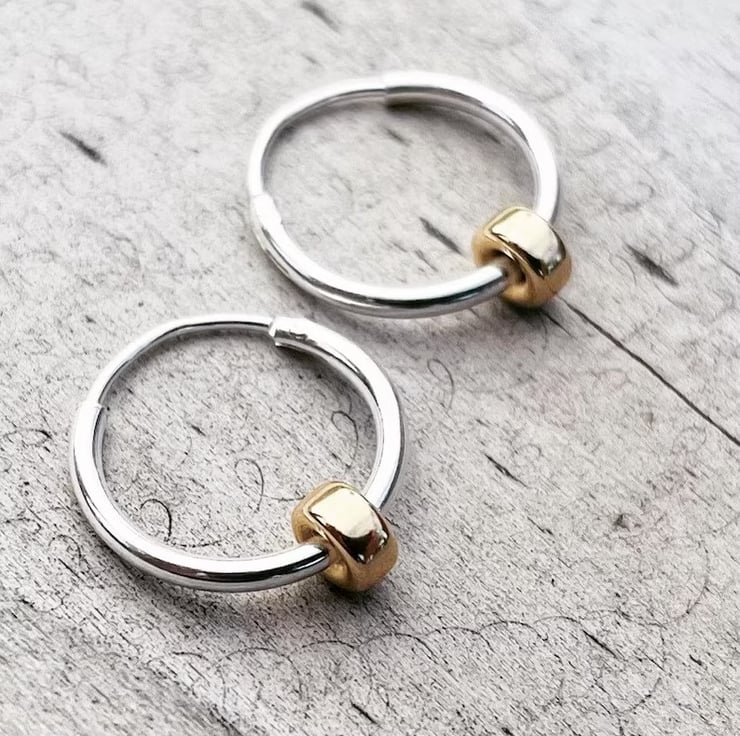 12mm sterling silver hoops, 1.25mm in thickness, with 4mm 14k gold filled rondelle beads. The beads are not fixed and will slide off so you change charms or wear the hoops plain. Unisex earrings. Free gift box tied with ribbon.