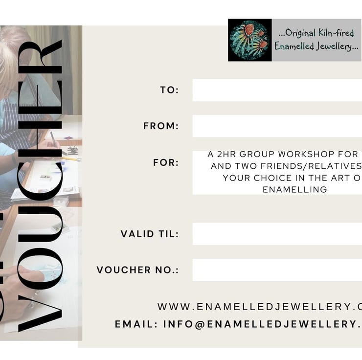 This voucher entitles the recipient and two friends/relatives to a two hour workshop in which they will each learn the basic skills and techniques to make a small item in enamels on copper. All tuition and materials are included and what’s more the pieces will be finished and ready to take home at the end of the session. Workshops take place at my Studio at Avoncroft Arts Centre in Bromsgrove, Worcestershire. To redeem the voucher the recipient uses the contact details provided to arrange a suitable date. Sessions usually take place on weekday and Saturday mornings.
