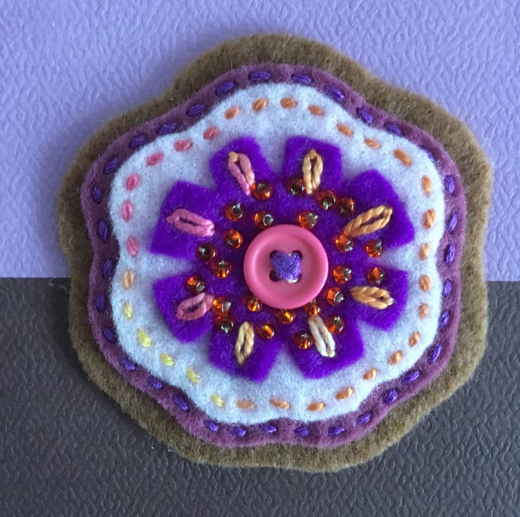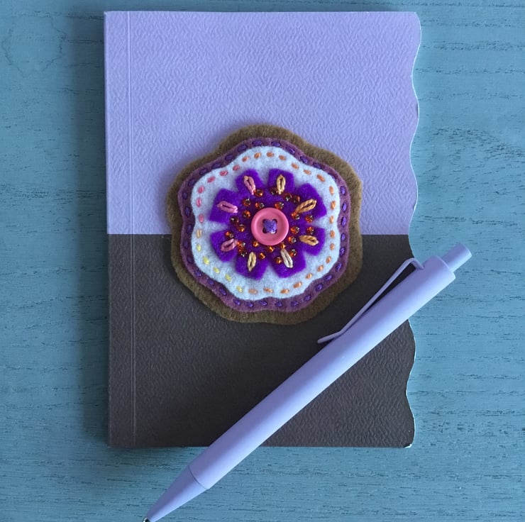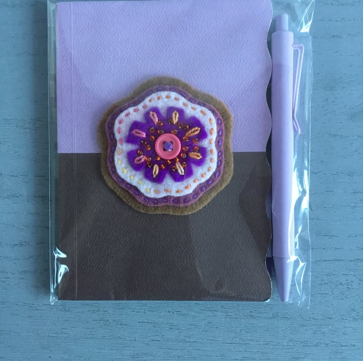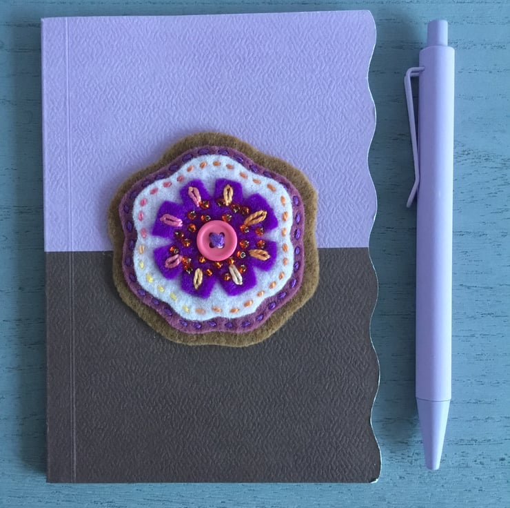 This Notebook and Pen Set has a hand embroidery on the lilac and chocolate brown front cover. A flower with a pink button at its centre, is created from purple, white and brown felt, hand embroidered with Running and Lazy Daisy Stitches and beads.