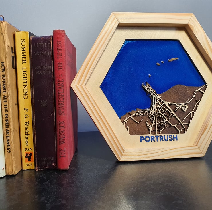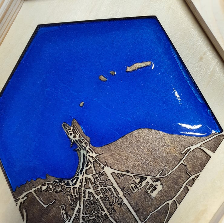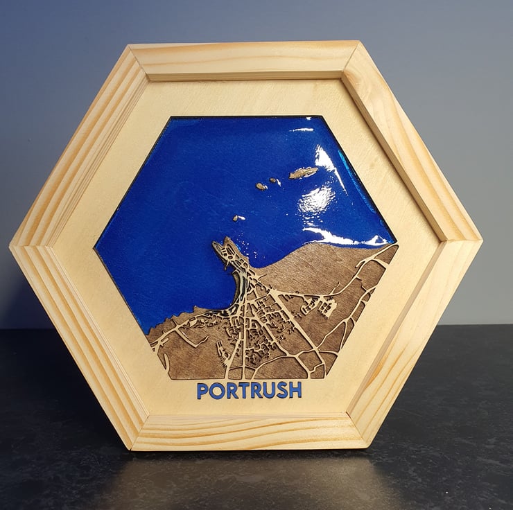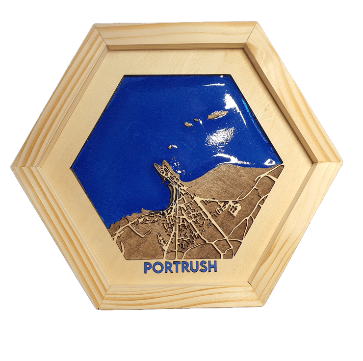 The frames are made from pine. The map is laser cut and the design is an interpretation by me based on Portrush.