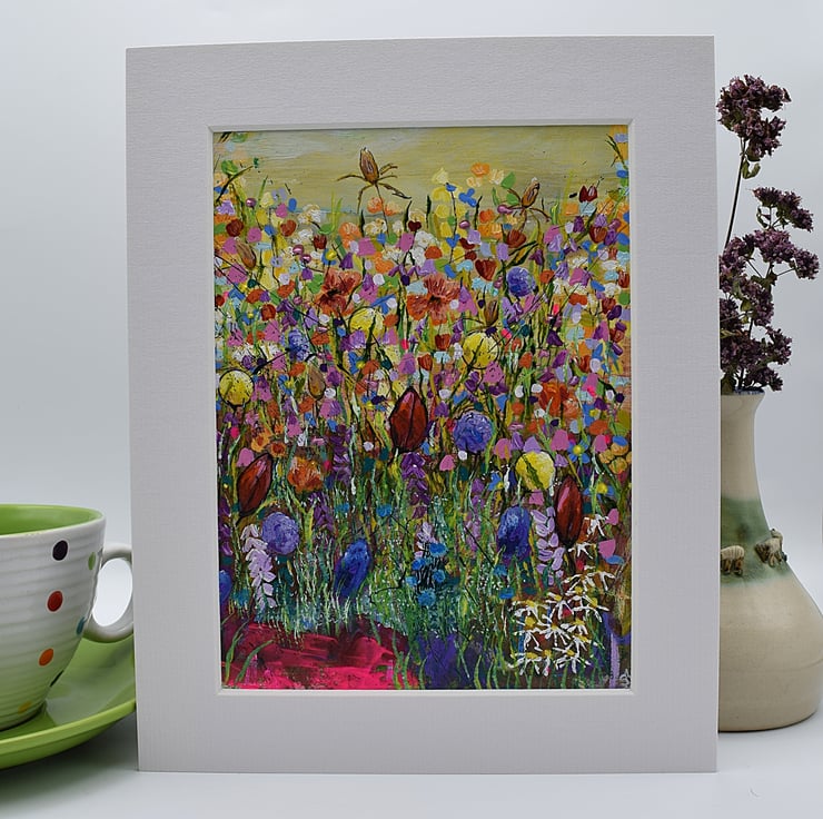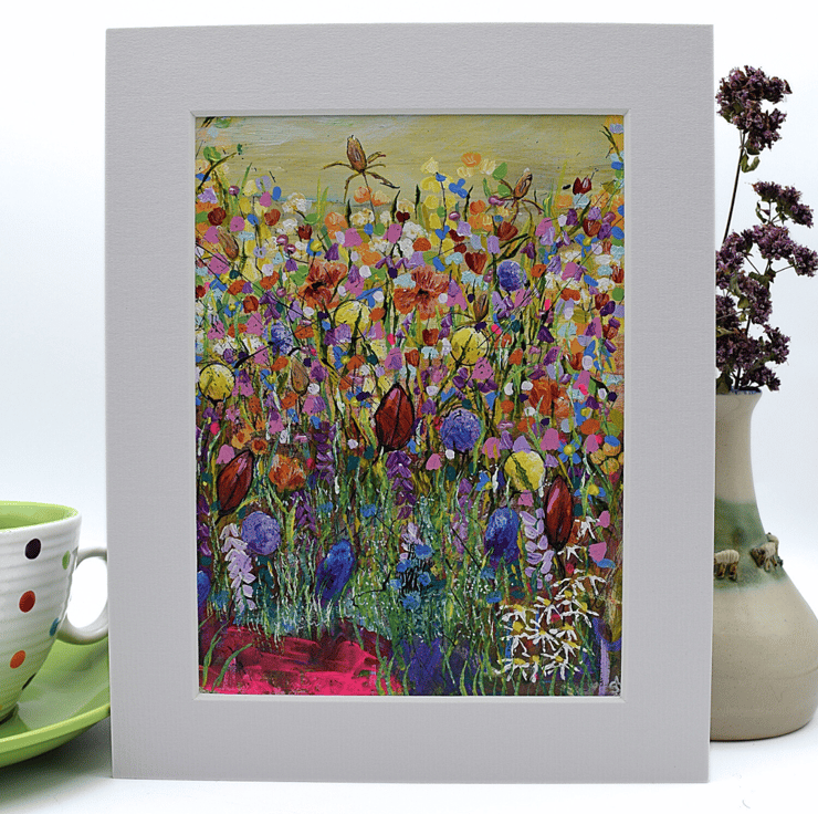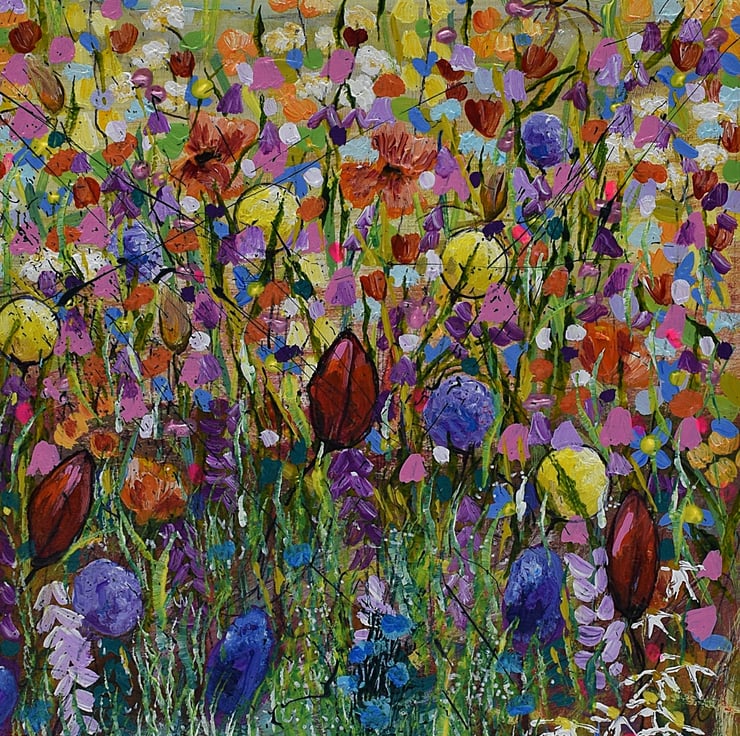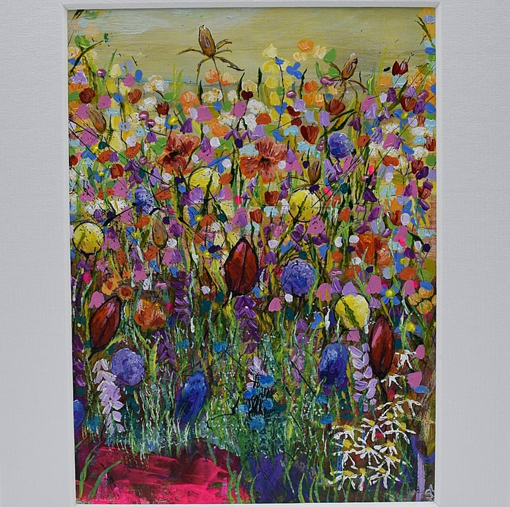 This original artwork is packed full of bright, light colours and textures to depict a flourishing patch of wildflowers. There is yellow in the sky to indicate the sunrise and a glorious day ahead.