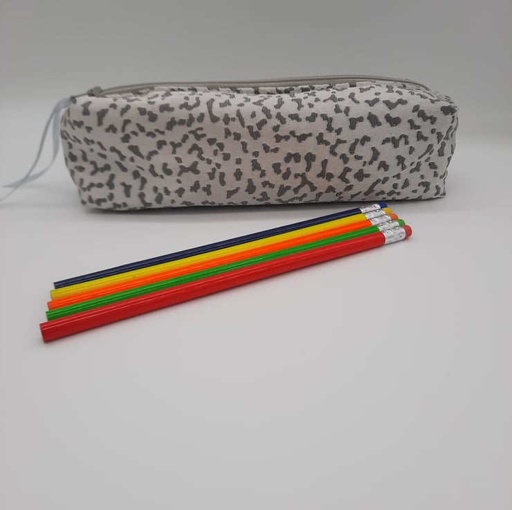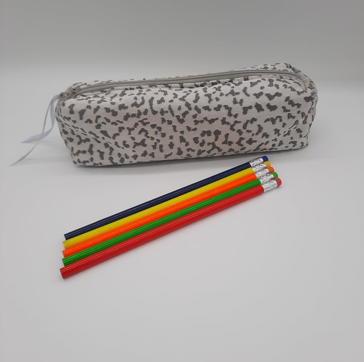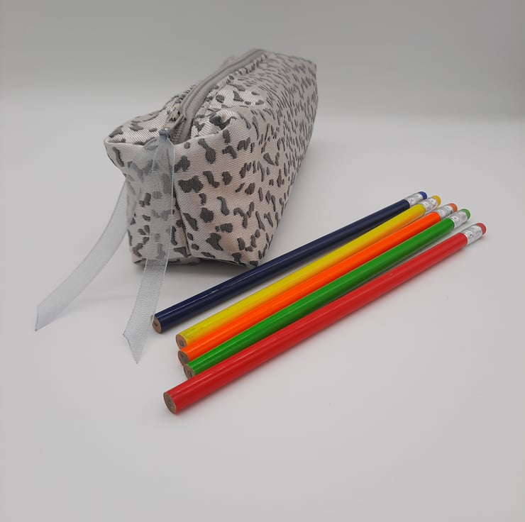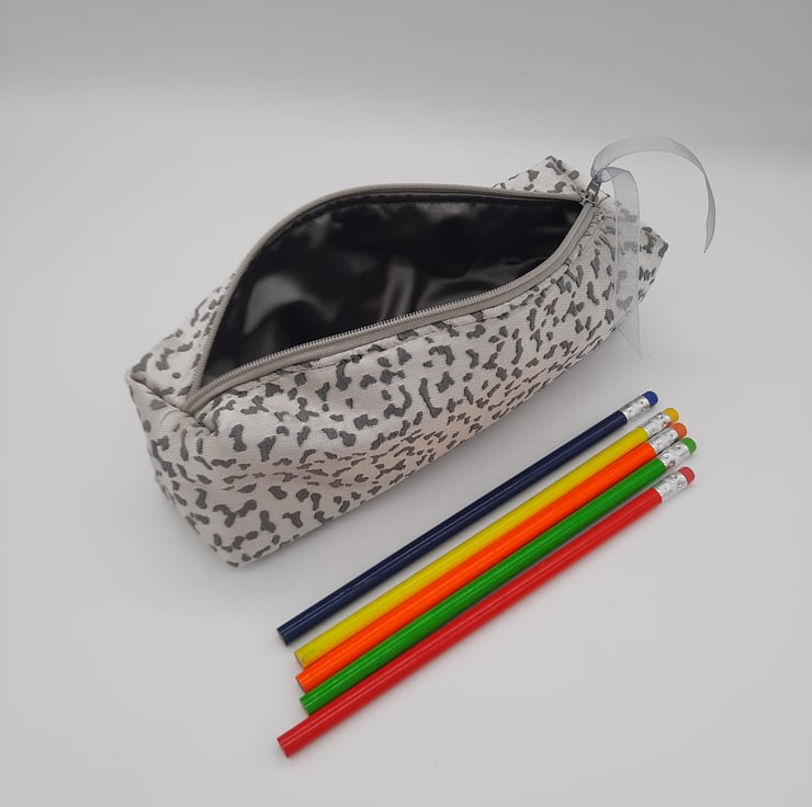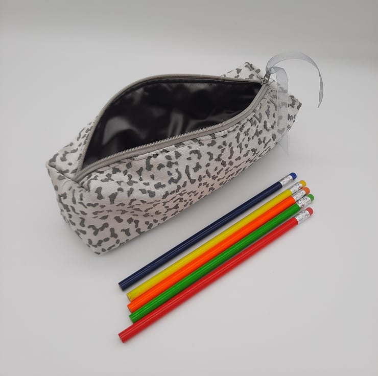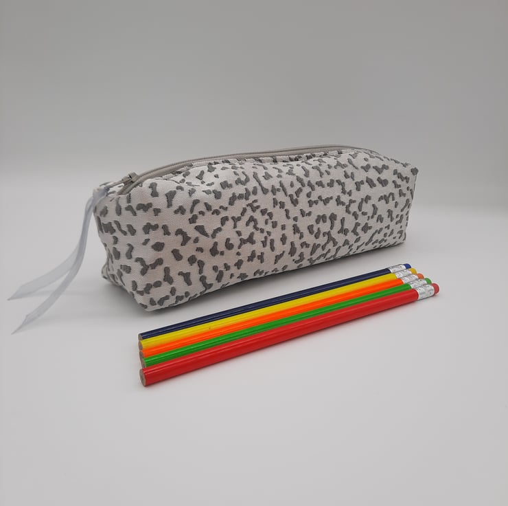 Boxed pencil case made using a silver fleck fabric. Lined with a slate grey satin fabric.