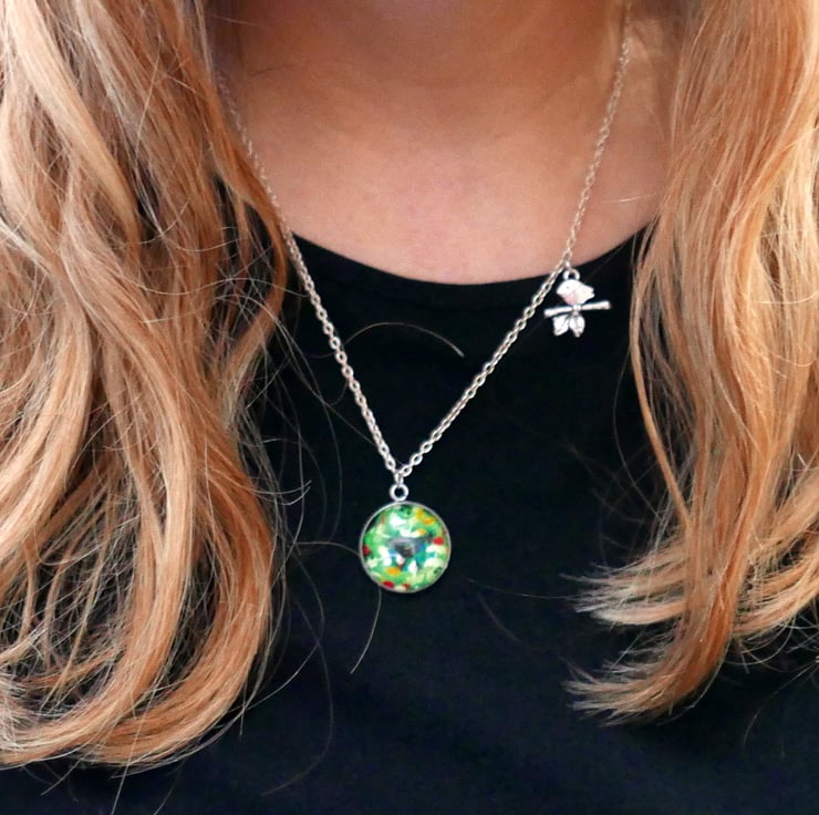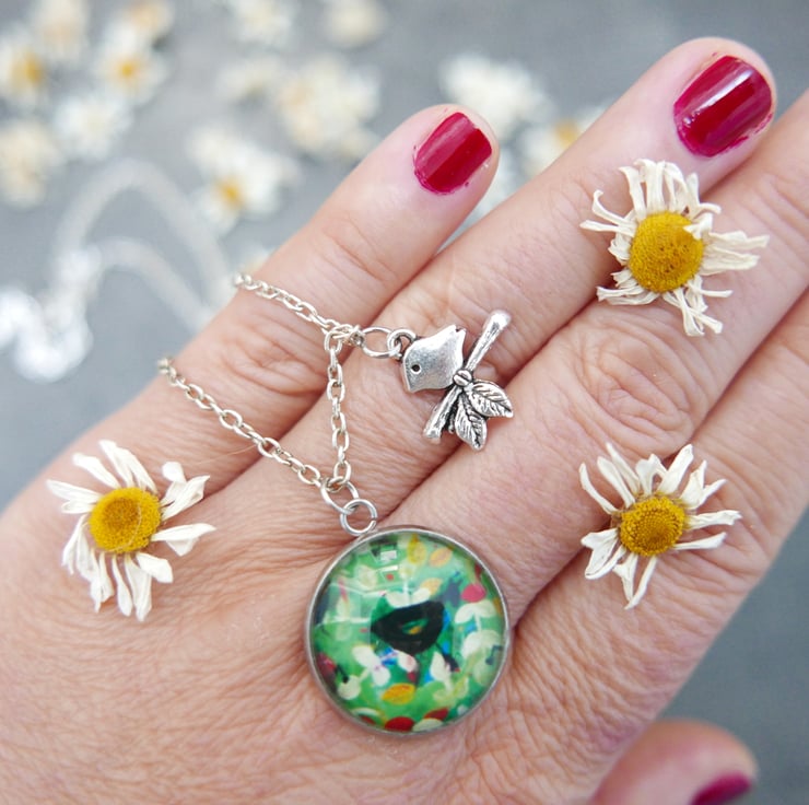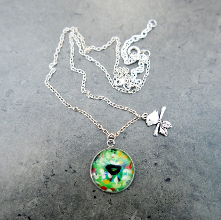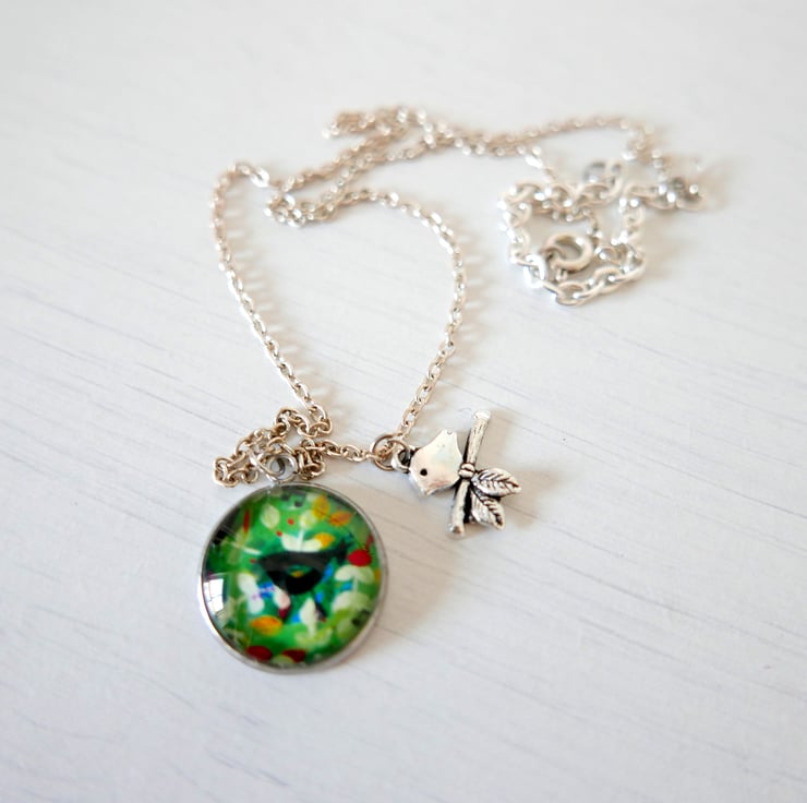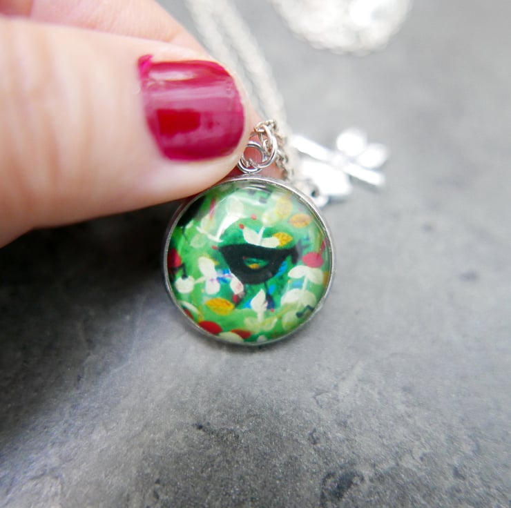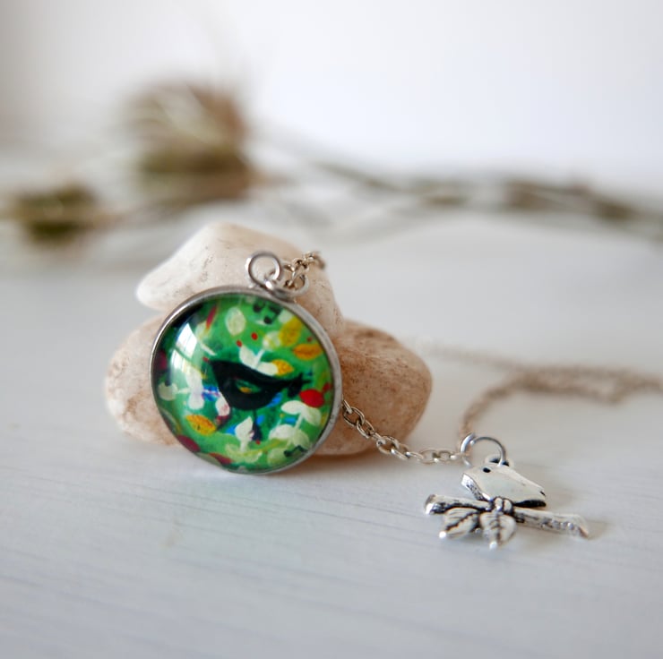 I made this necklace using a blackbird pendant with an image after one of my original paintings and a bird charm on the side. The necklace is very pretty and the metal chain is adjustable from 16" to 18" to 19.5" (three sizes in one). Two of the photos show it worn and you can see two sizes. This is an artwork and a piece of jewellery in one and it is perfect for someone who likes quirky one-of-a-kind jewellery but also someone who likes birds and nature.