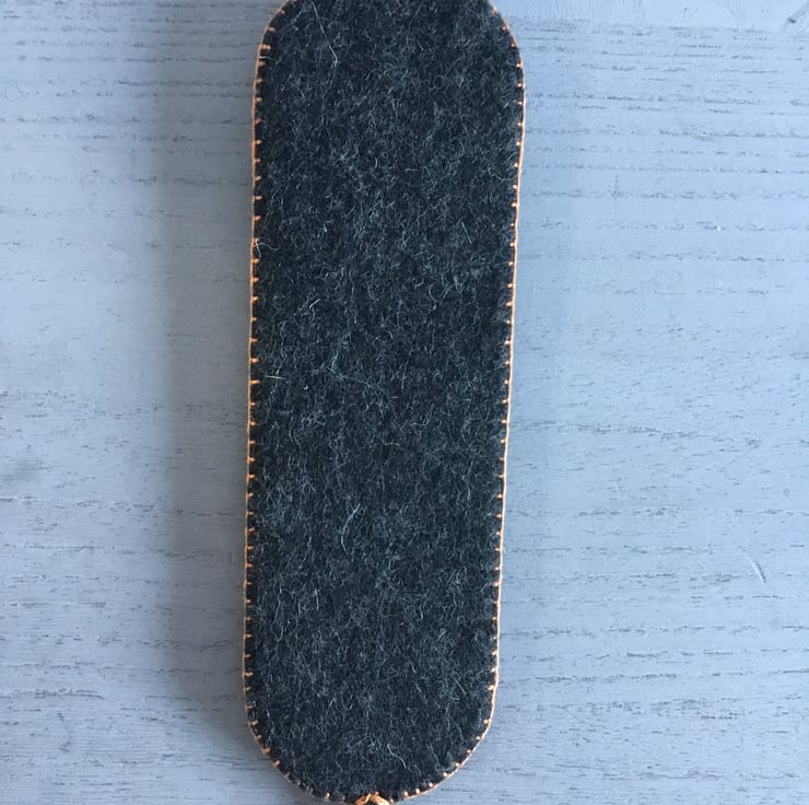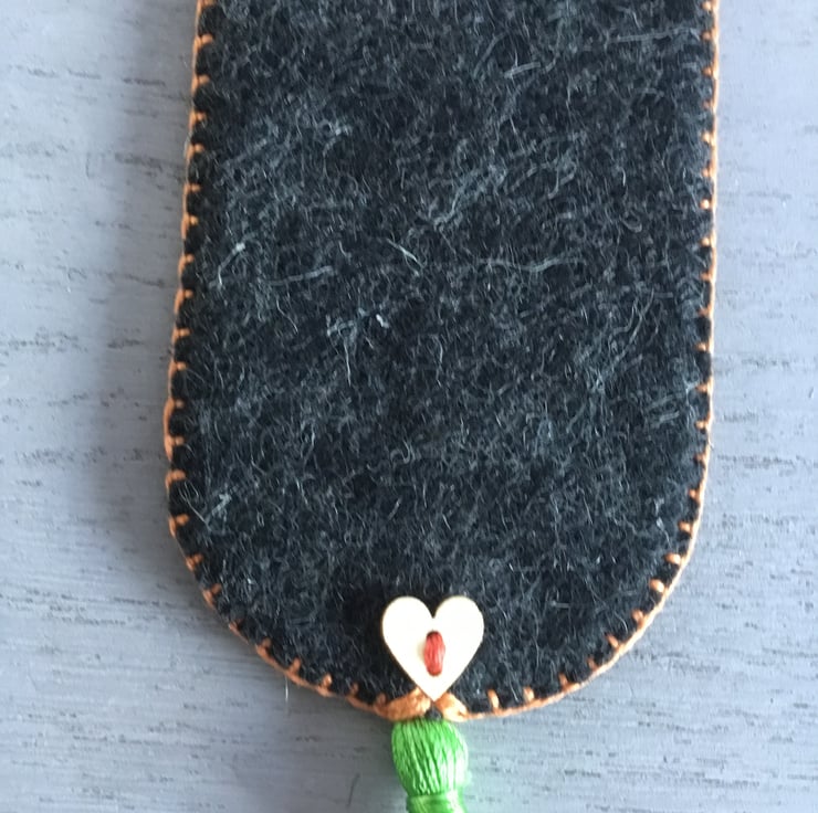 The embroidery is on charcoal coloured wool felt, with cardboard inside, edged with hand embroidered Blanket Stitches in umber embroidery thread. A green tassel decorated with a small wooden heart is at the bottom. It’s approximately 20 inches in length and 2 inches wide.