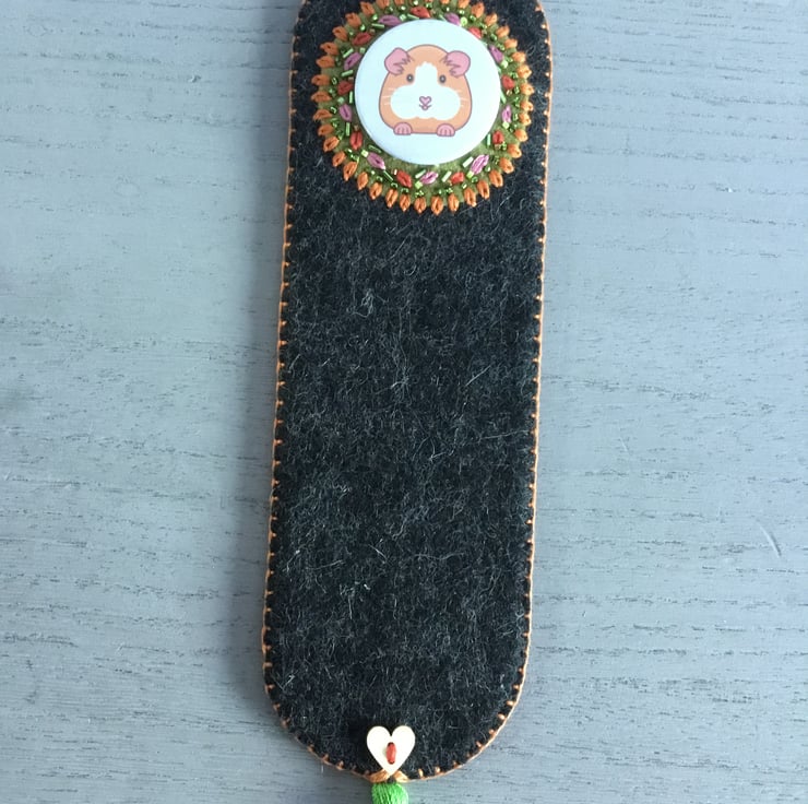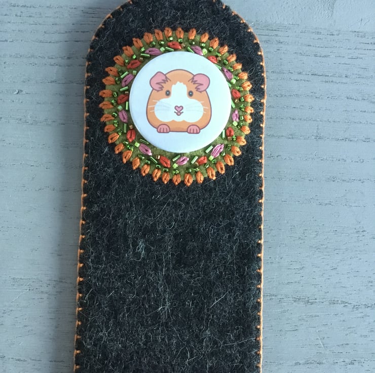 This Guineapig Bookmark has a hand embroidered picture of a Guinea pig. A badge with a cute Guinea pig is sewn onto an olive green circle. She is surrounded by hand embroidered Lazy Daisy Stitches with green and bronze seed and bugle beads.