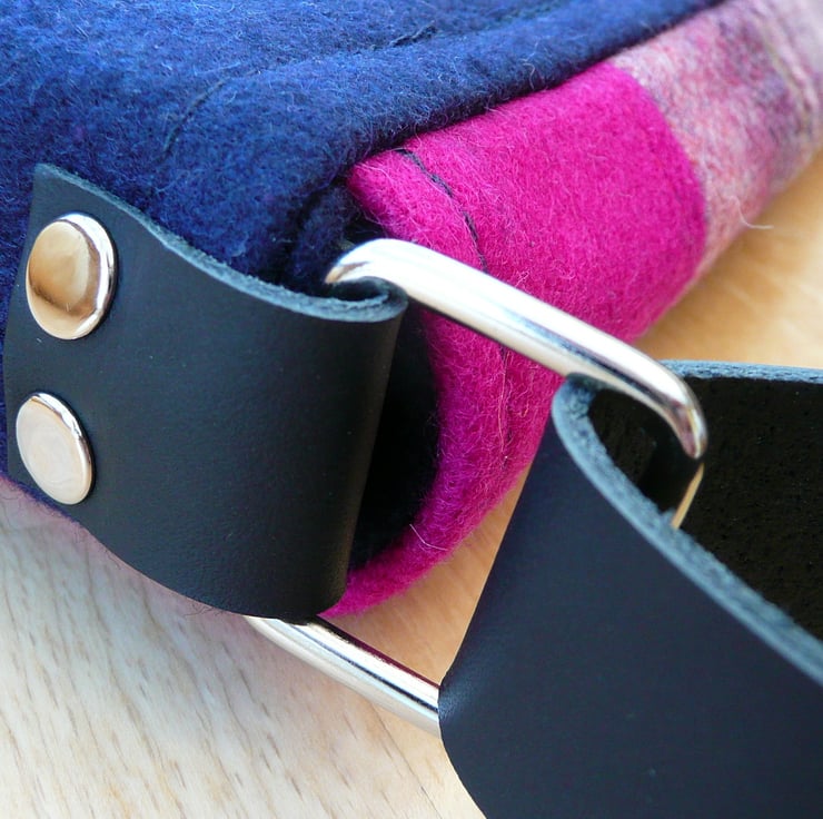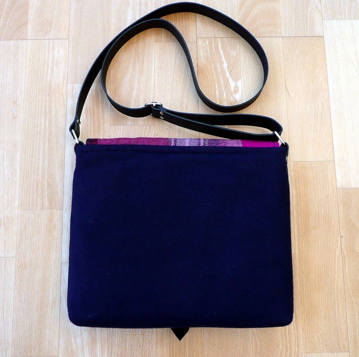 This crossbody bag is made from Abraham Moon wool tweed swatch pieces and heavy navy blue tweed. I have patchworked the swatch pieces to create the front of this crossbody shoulder bag, and used a heavy navy blue tweed for the main body of the bag and all finished of with a 1" wide black leather crossbody / shoulder strap and silver nickel bag hardware.
