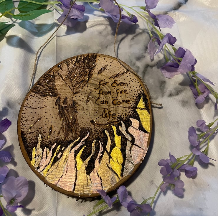 Life felt like it was burning around me. And in that moment I picked up my wood burning pen and cathartically designed this picture. The flames looked flat and I found gild lane and decided to incorporate their beautiful acrylic gilding into not only this but my other pieces too. So whilst this is very experimental for me it’s been a turning point. So truly from a moment where it felt like my world was on fire has come new life