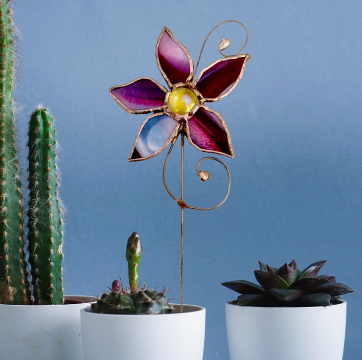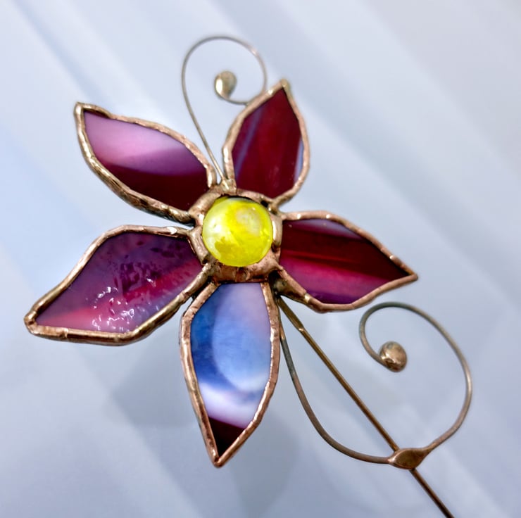 This plant pot flower ornament is made from mottled cranberry, cream and blue stained glass with a sunshine yellow jewelled centre. It has a long 10 inch copper rod stake to push into the soil of your plant pots and has an antique copper finish.