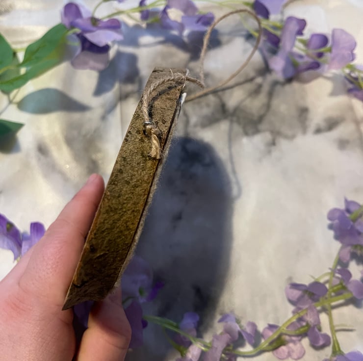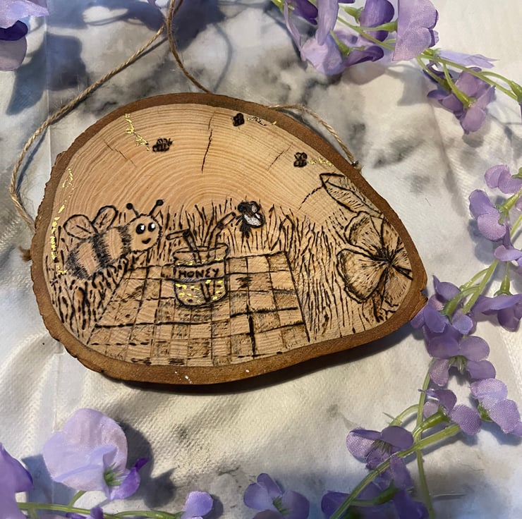 Wood burnt into a wood slice from a mixed bundle so I'm unsure of the type of wood and eyelet fixtures with twine ready to hang. Finished using danish oil.