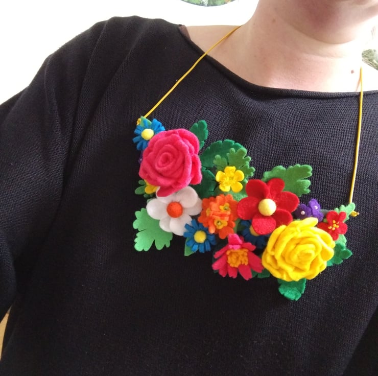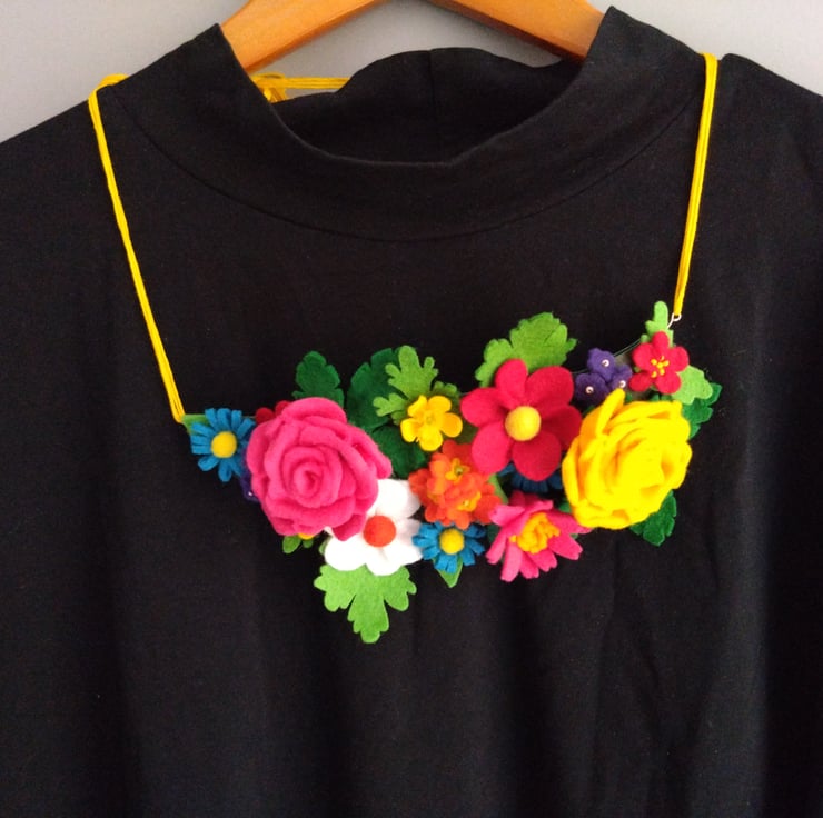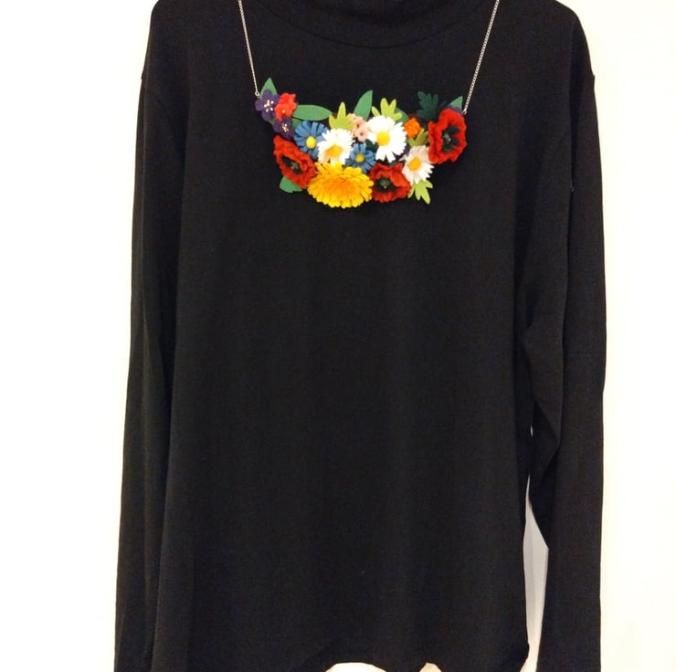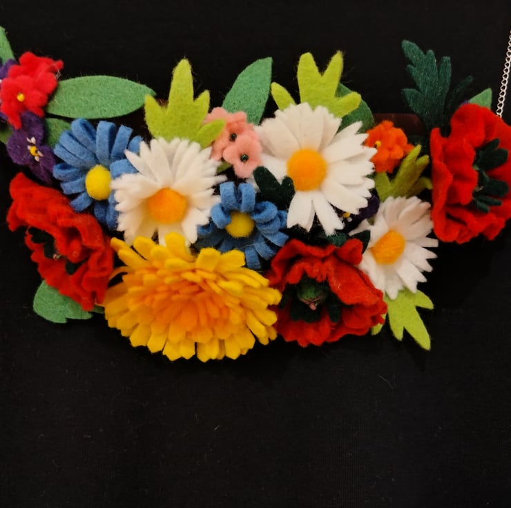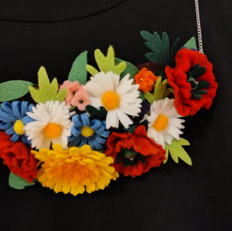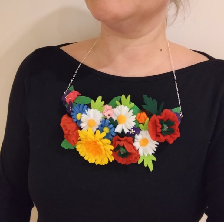 This beautiful and light neckless is assembled from handmade felt flowers attached to a leather base and fitted with a sterling silver chain / leather cord with a spring ring clasp. It is a 'must have' piece for a special celebration or to be worn on any day to brighten your mood and of all you meet. Its vibrant colour scheme and choice of flowers evokes a fresh spring meadow in a full bloom. This is a 'one of piece' and although it can be made to order each piece will be unique so you can be sure no one else has the same one.