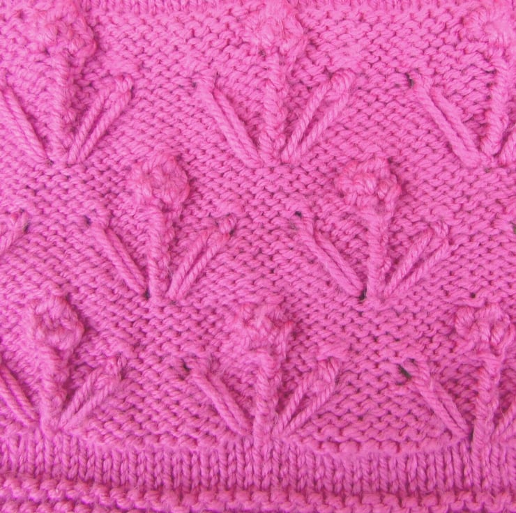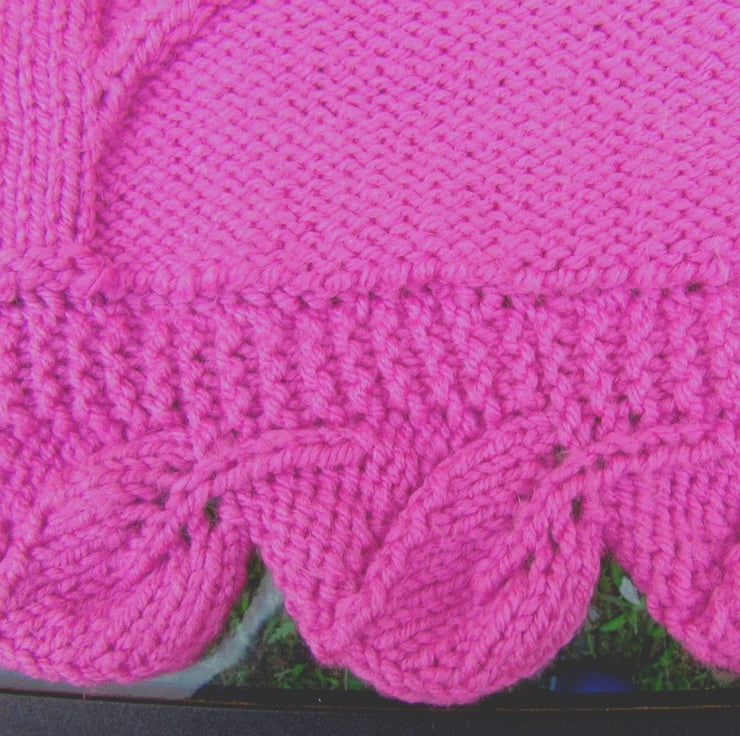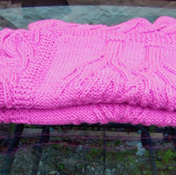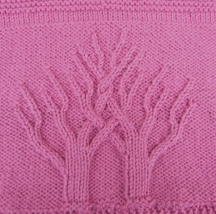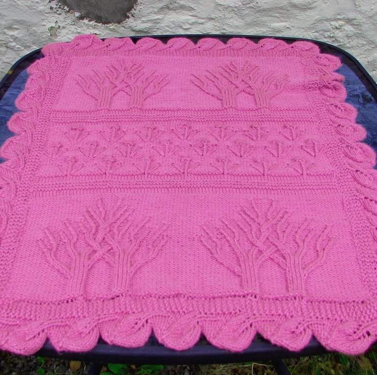 This baby's cot or pram blanket is hand knitted in machine washable soft acrylic aran yarn. A beautiful blanket which has a tree of life and flowers pattern in a lovey shade of deep pink.