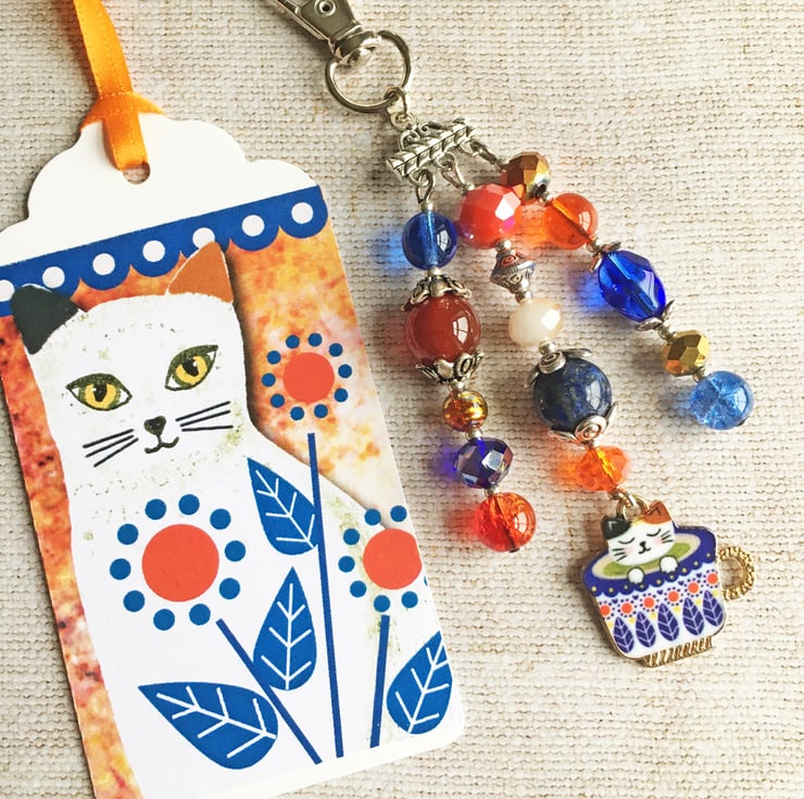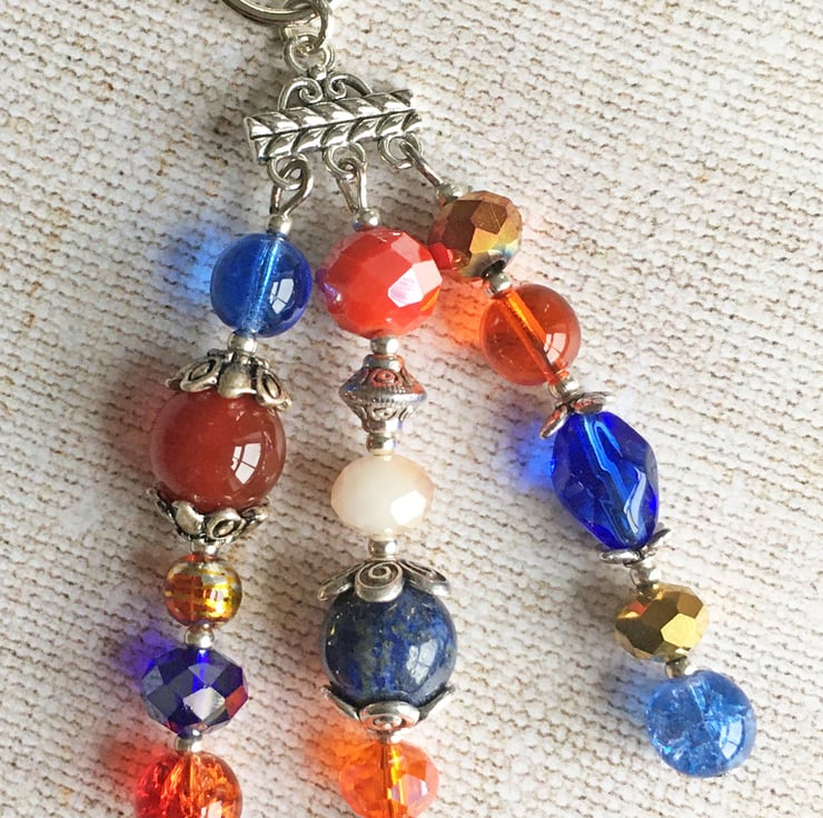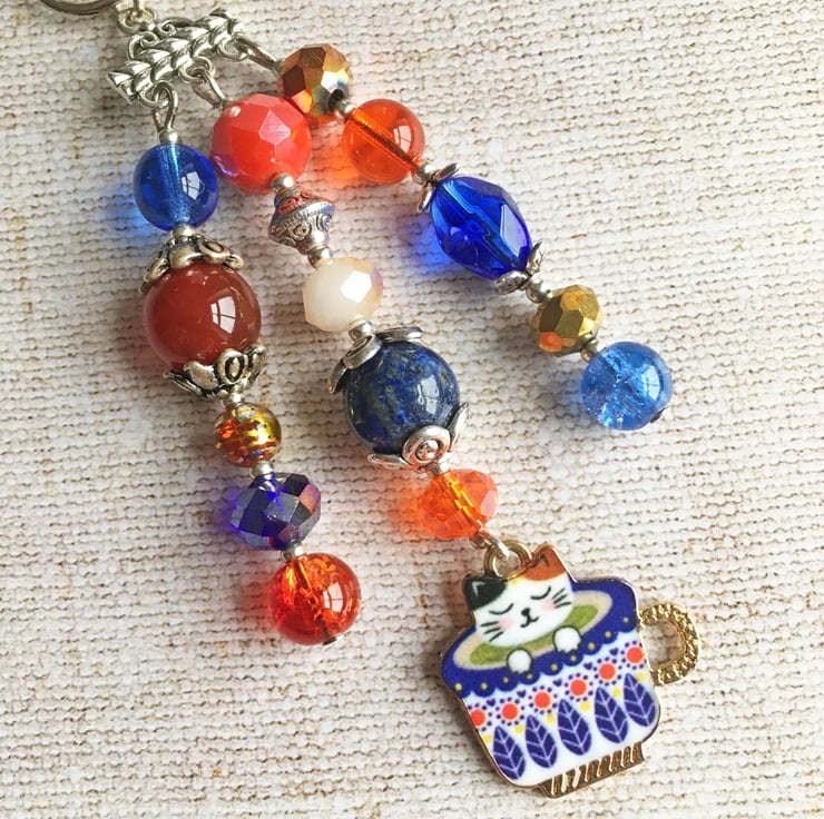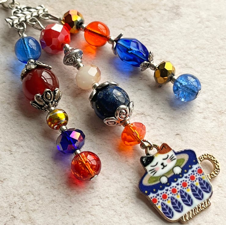 I've used a cute enamel charm and an assortment of glass and semi-precious beads including Lapis lazuli, Carnelian and crackle glass.
