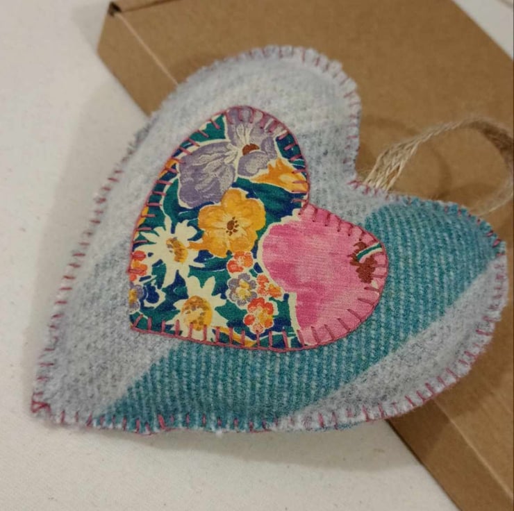 A gorgeous heart in beautiful upcycled wool and cotton fabrics, salvaged from Welsh wool blankets and vintage clothes. Hand sewn with a blanket stitch and stuffed with quality wadding, with a jute hanging loop.