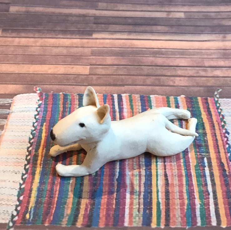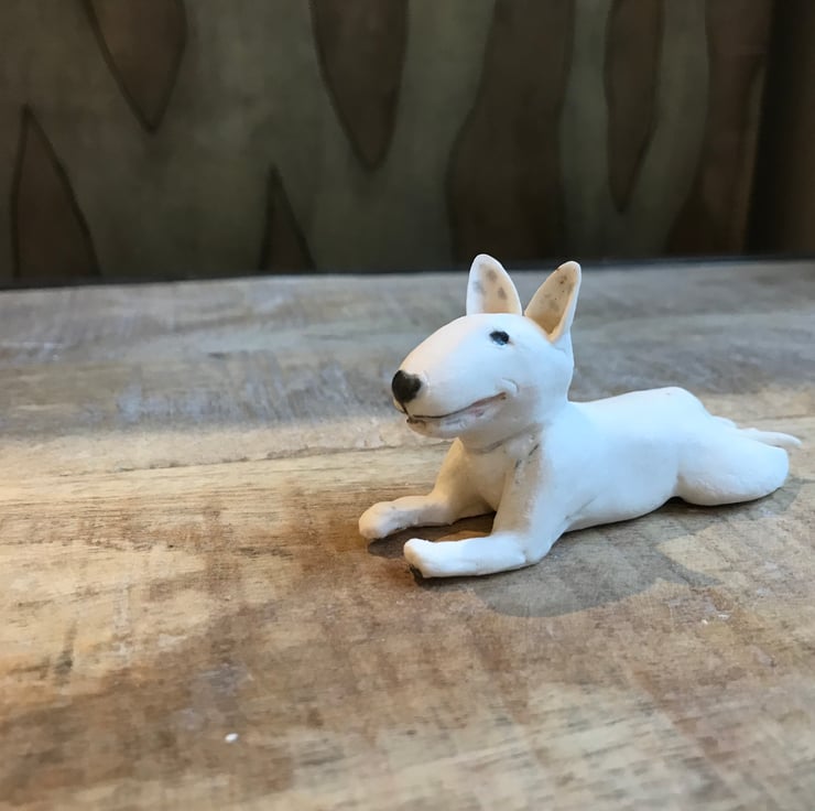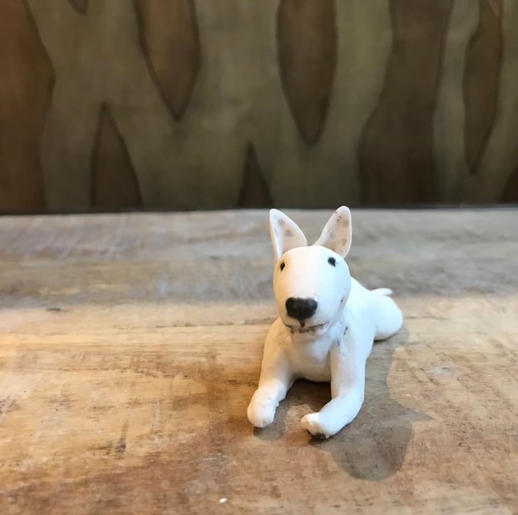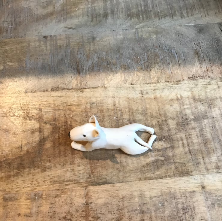 Very miniature bull terrier! Measures roughly 8cm long and is featuring a relaxing sploot.