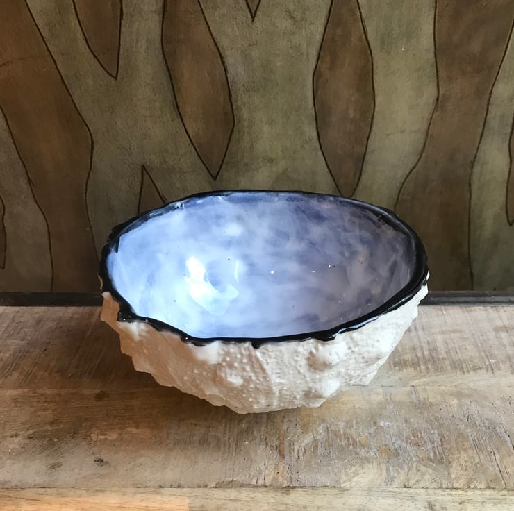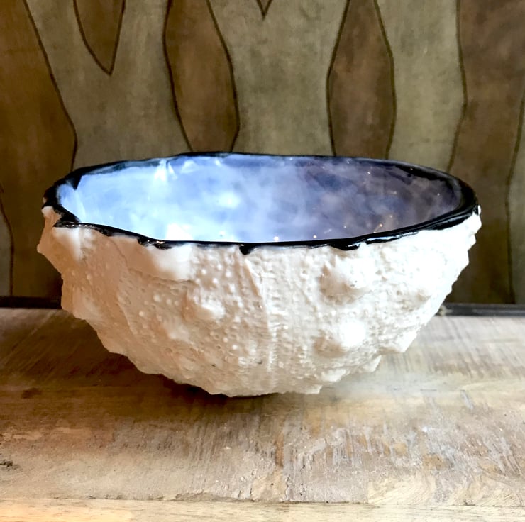 This urchin bowl was glazed on the inside with a dark blue celadon glaze then topped with a white celadon glaze, giving it a stormy ocean look. The outside has been left unglazed to better show the urchin details.