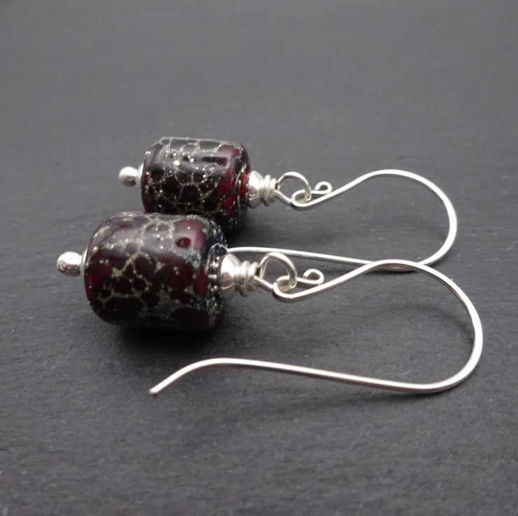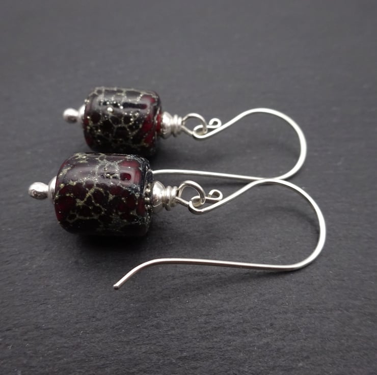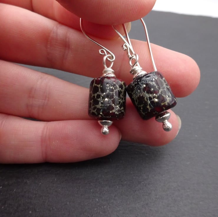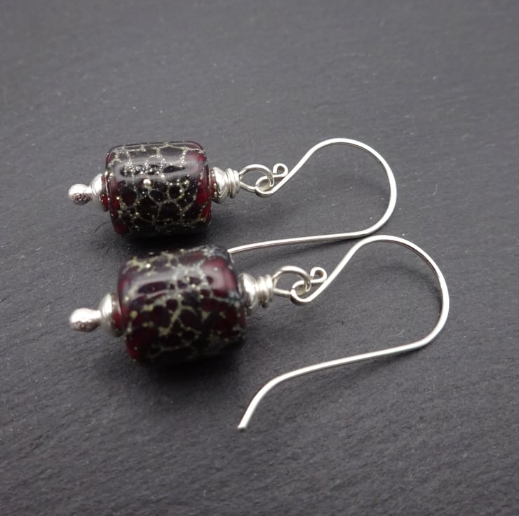 A pair of earrings made with handmade sterling silver ear wires, sterling silver beads and handmade lampwork glass beads.