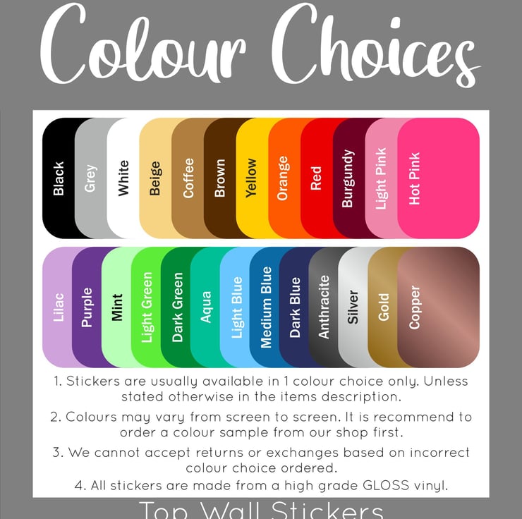 - 25 colour choices available for most stickers (check the colour chart or order a sample).