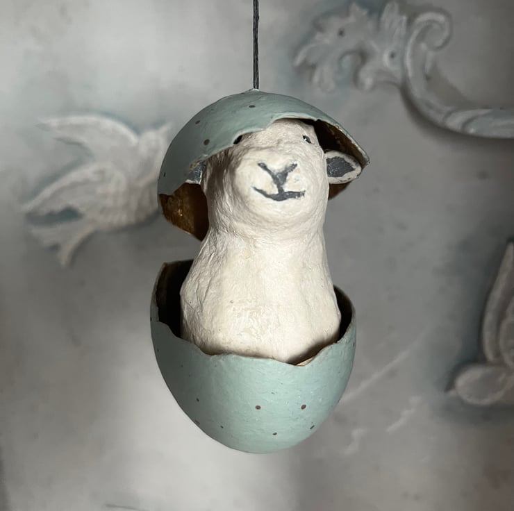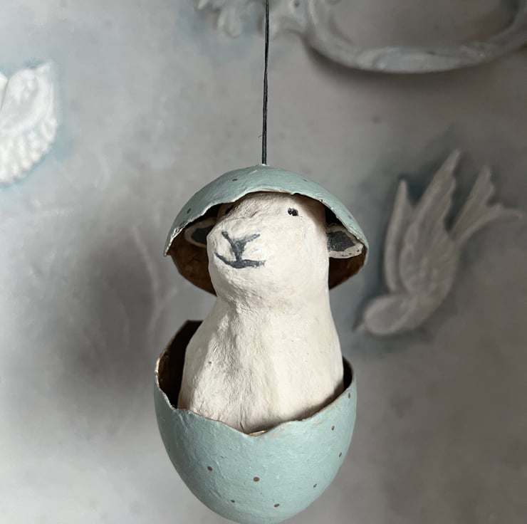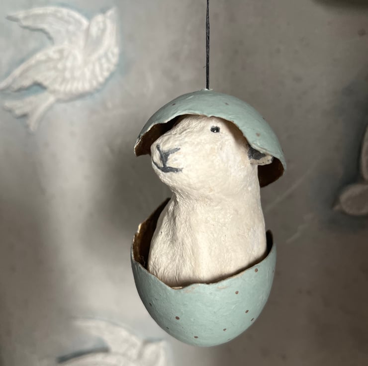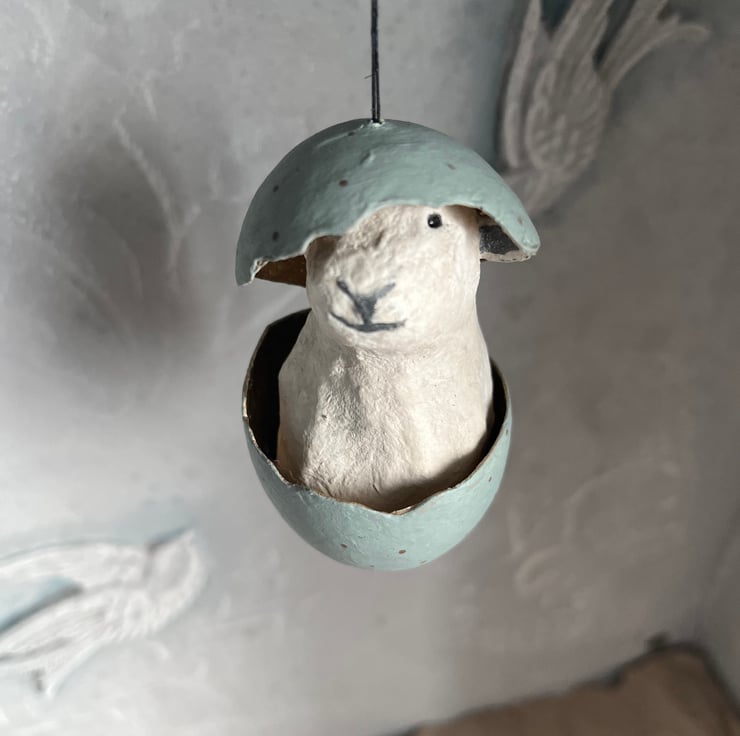 A little sheep made up of florist wire, layers of recycled paper, cotton wool, and glue, then finished with chalk paint and wax. The cup has been made from cardboard covered in layers of gluey paper, strips of cardboard, punched circles and tiny relief sheep, before being primed and painted, and embellished with vintage buttons.
