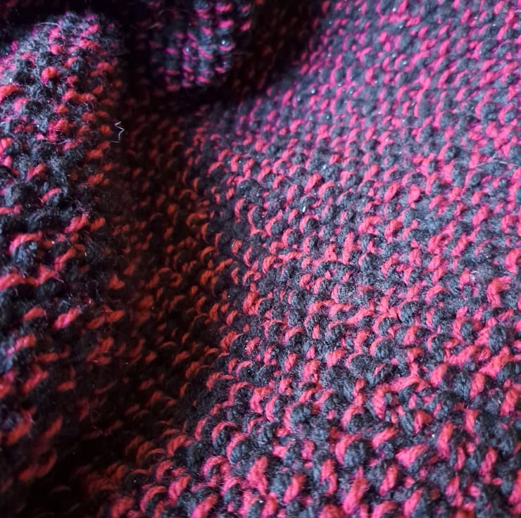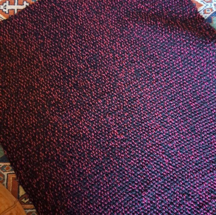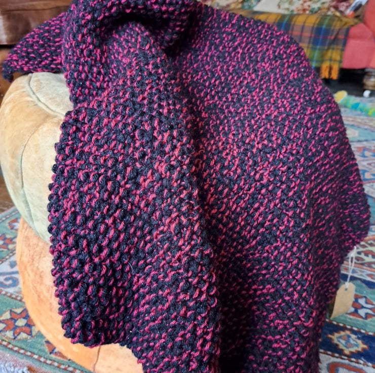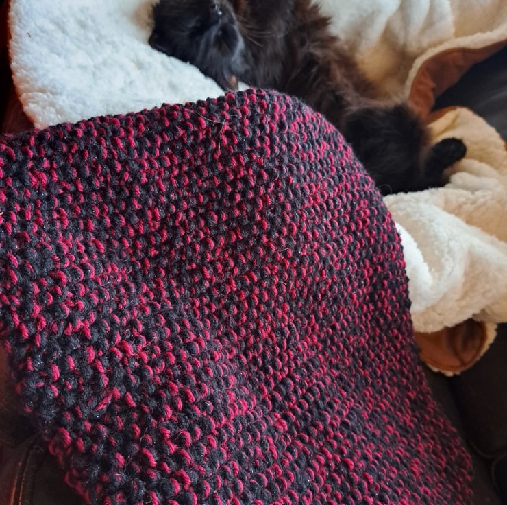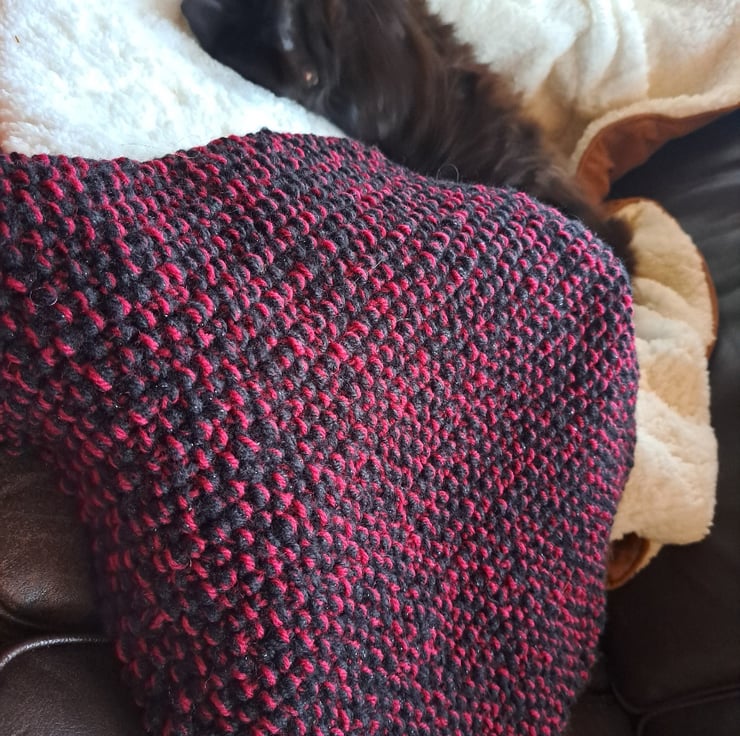 A nice thick hand-knitted and washable pet blanket made by my mum (proceeds to charity). Made out of black and claret acrylic yarn. 98cm by 87 cm. Comfy and cosy.