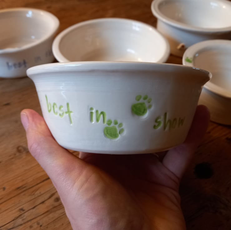 Best in show Pet bowl. Ideal for your small doggy or 'large' Cat. Paw print and stamped then hand painted in Green. 3/4 of a pound in weight. 14cm diameter 5cm high. Hand wash only.