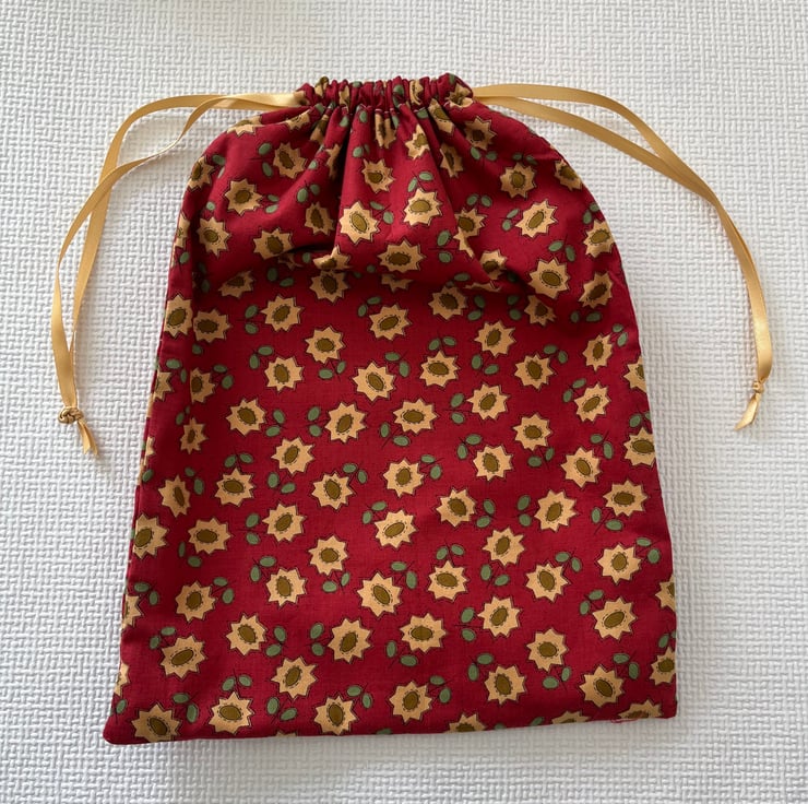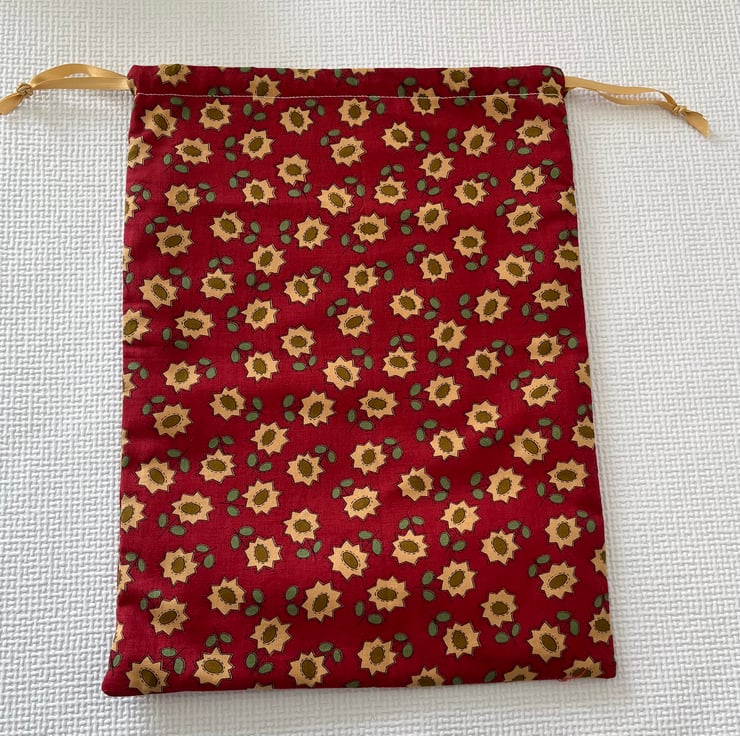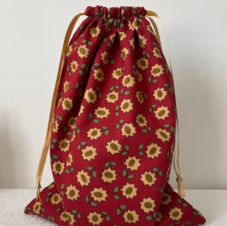 A gorgeous floral themed print was used to make this cheerful drawstring bag which measures approximately 33cm x 25cm.