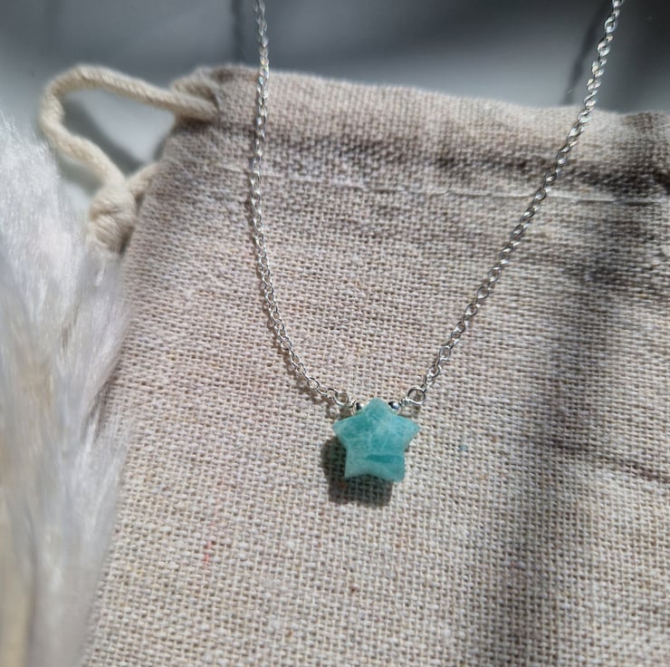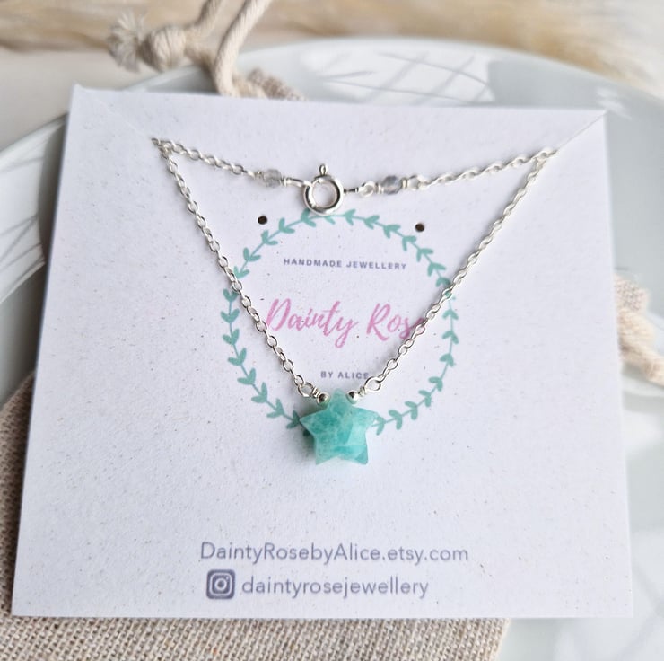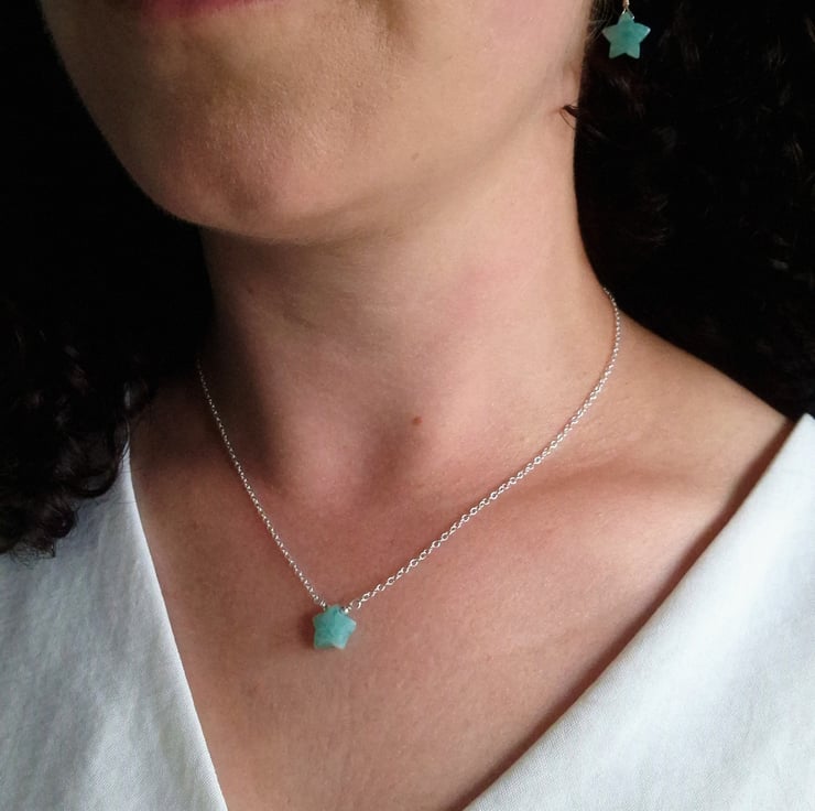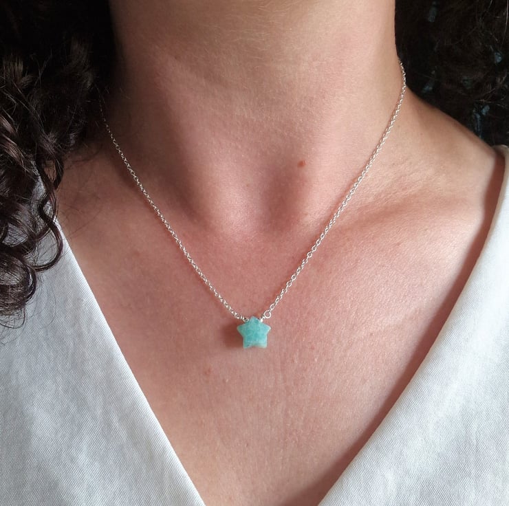 Made with a 12mm amazonite gemstone in the shape of a star and Italian sterling silver chain and sterling silver wire.