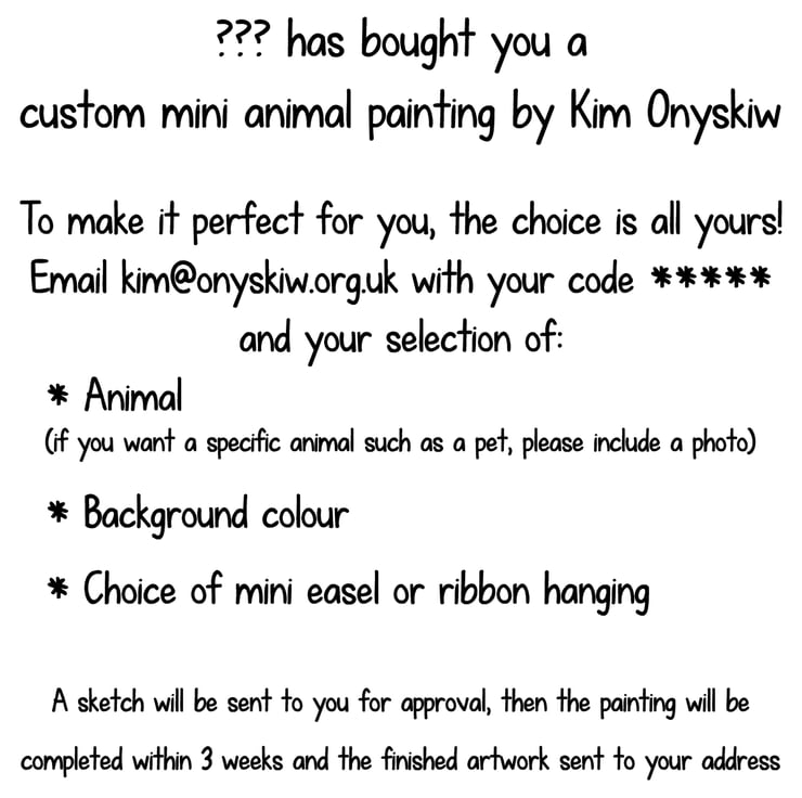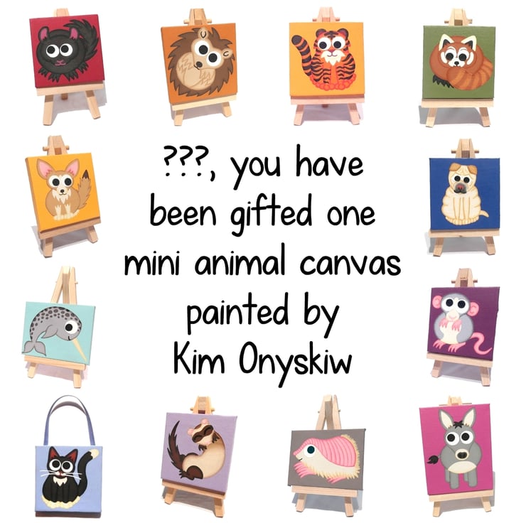 This gift voucher will get the recipient one mini animal canvas, painted in acrylics on either a 7cm x 7cm or 8cm x 10cm canvas (depending which works best for the animal).