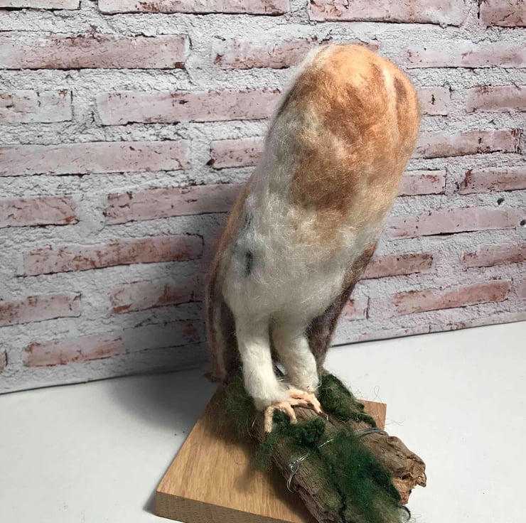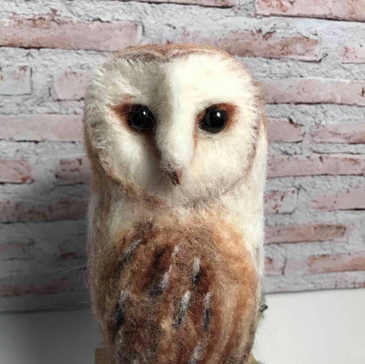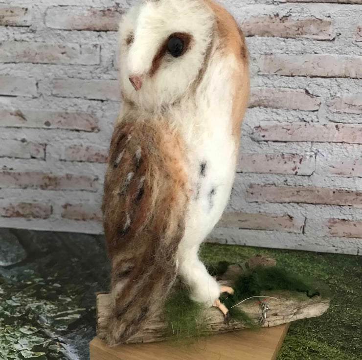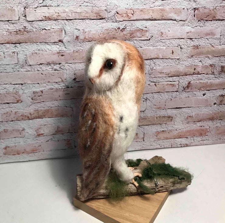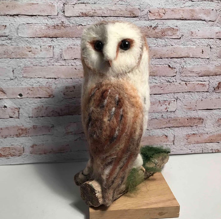 Wool and a barbed needle created this soft sculpture of the owl standing on driftwood.