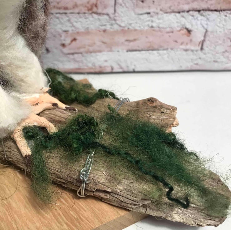 The owl is wired through the legs and the wire then wraps round the driftwood.