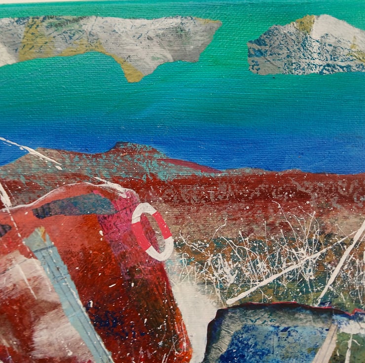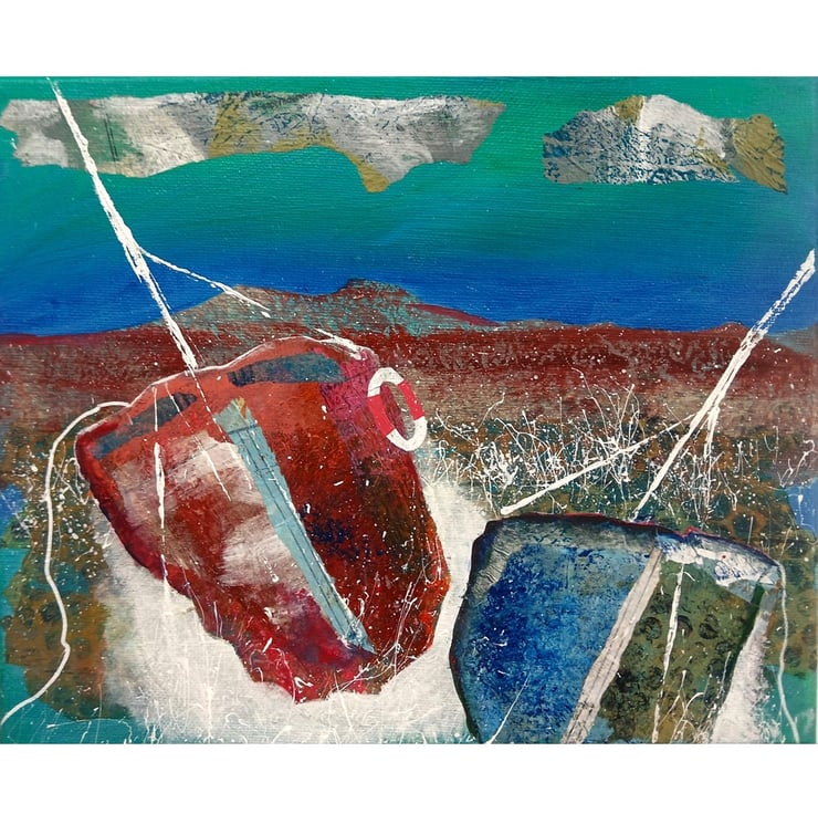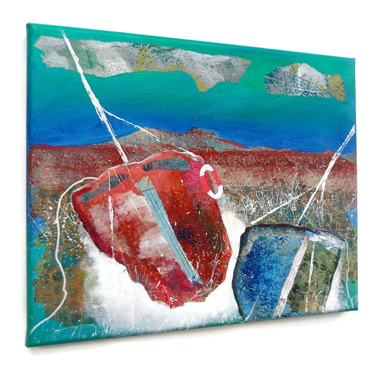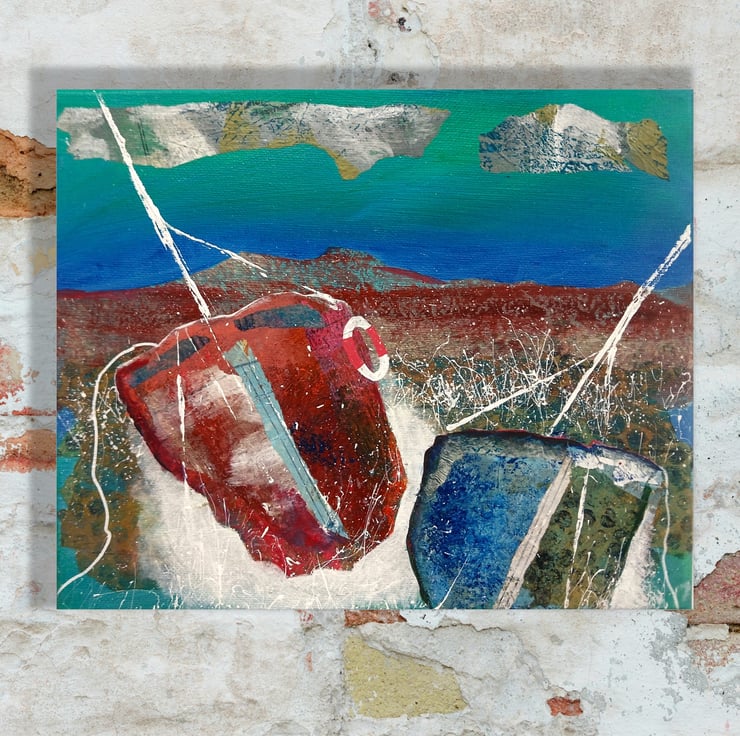 Coastal / nautical, abstract style painting in acrylic and collage on 12 x 10 inch stretched canvas with painted edges so no framing is necessarily required - alternatively, frame for further impact. In a rich colour palette with sinuous lines, bold shapes with paint splashes. It will be signed by Beatrice before dispatch and comes with certificate of authenticity.