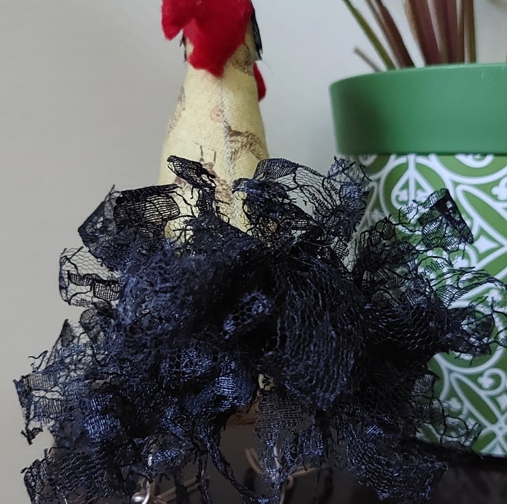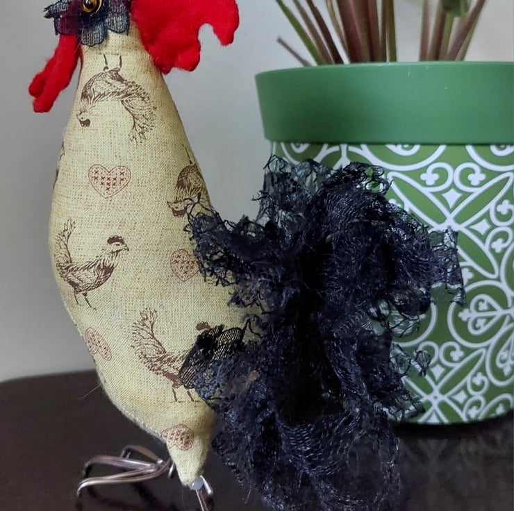 This is Cogburn, and he's ready to crow! Cogburn was created to celebrate the birthday bird for November. The chicken print fabric remnant was an opportunity too good to miss!