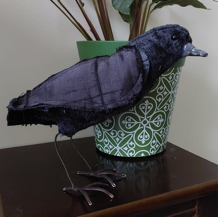 Quirky corvid fabric bird, handcrafted from fabric remnants and other recycled materials. Freestanding approx 15cm height. Please note that this is not a toy.