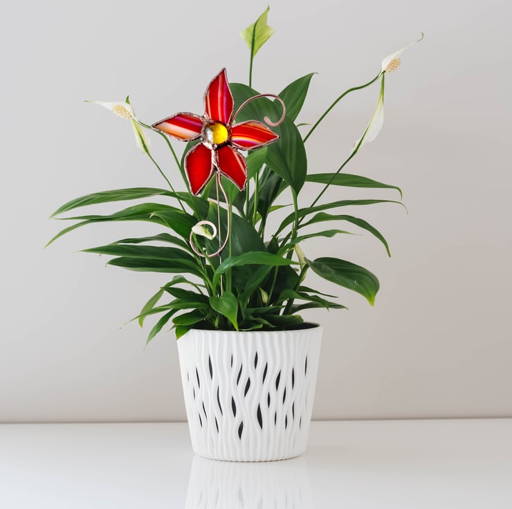 This lovely summery plant pot ornament is made from a unique glass called Opal Art. I've used a mix of deep red, orange and cream for the petals and 100 percent beaten copper for the art nouveau style detail.