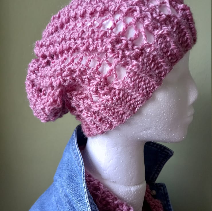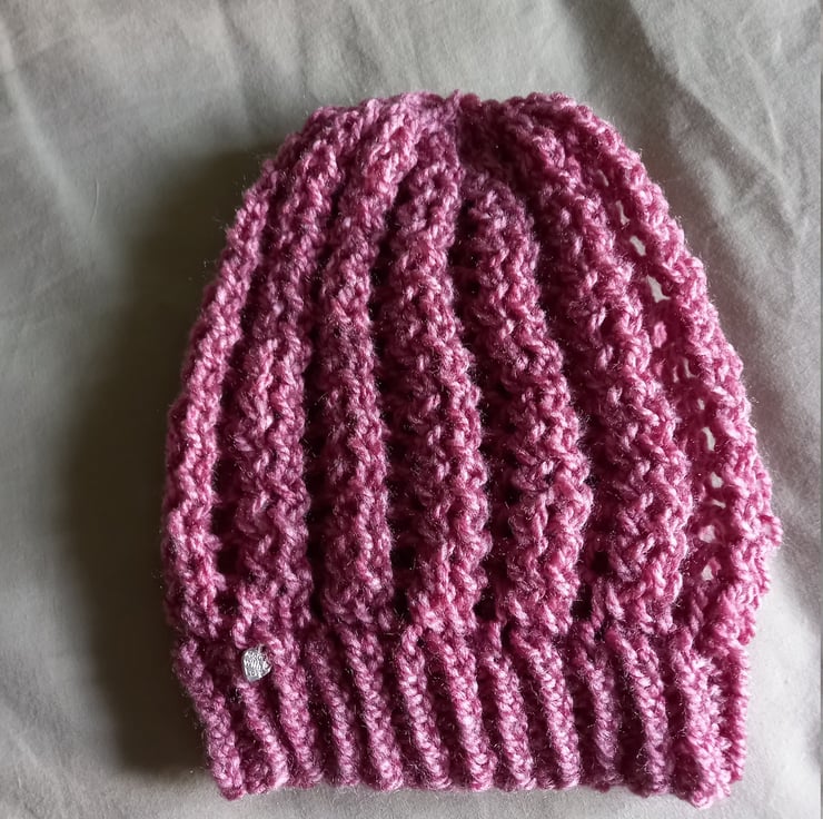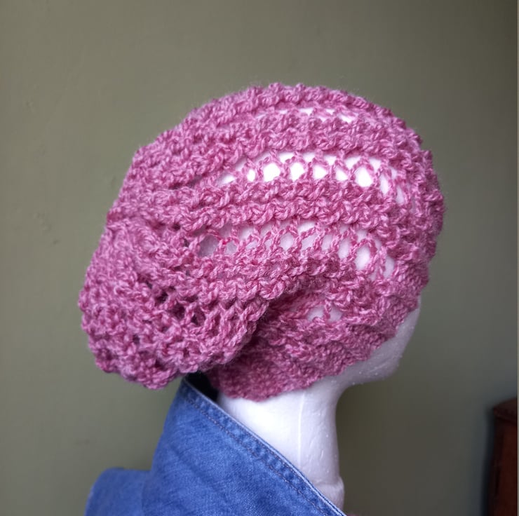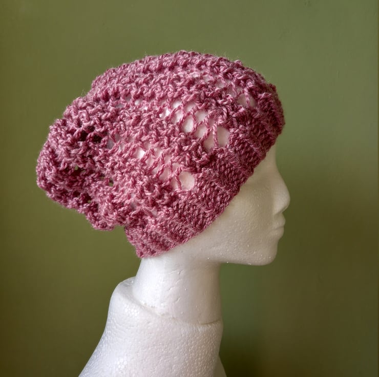 slouchy Beanie Hat hand knitted in a premium quality, Chunky yarn featuring a pretty, lacy design.